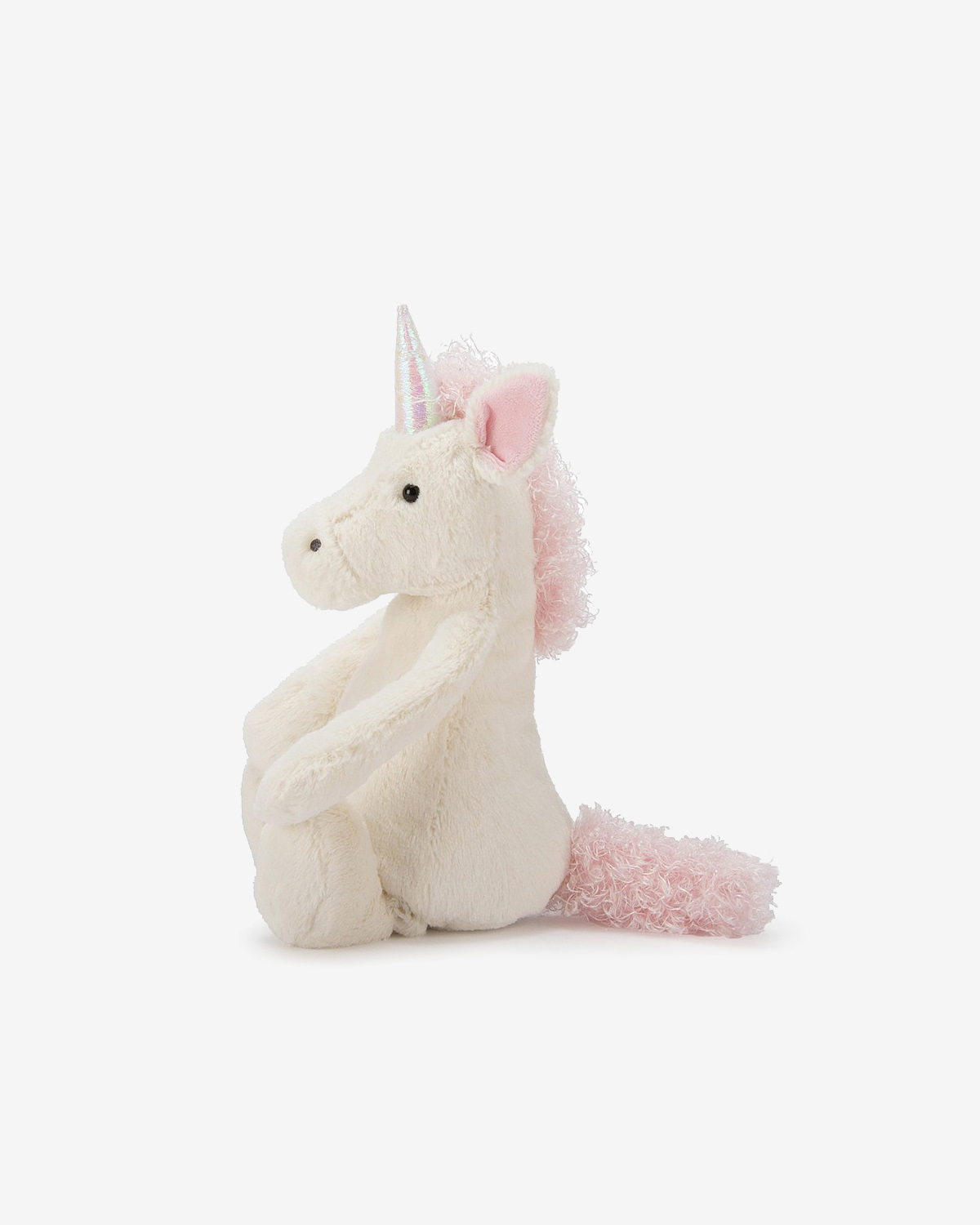 Ten uroczy bajkowy stwór ma wspaniałe futerko kolorze kremowym, miłą mordkę, sterczące uszka, piękny srebrny różek oraz wspaniały różowy ogonek.