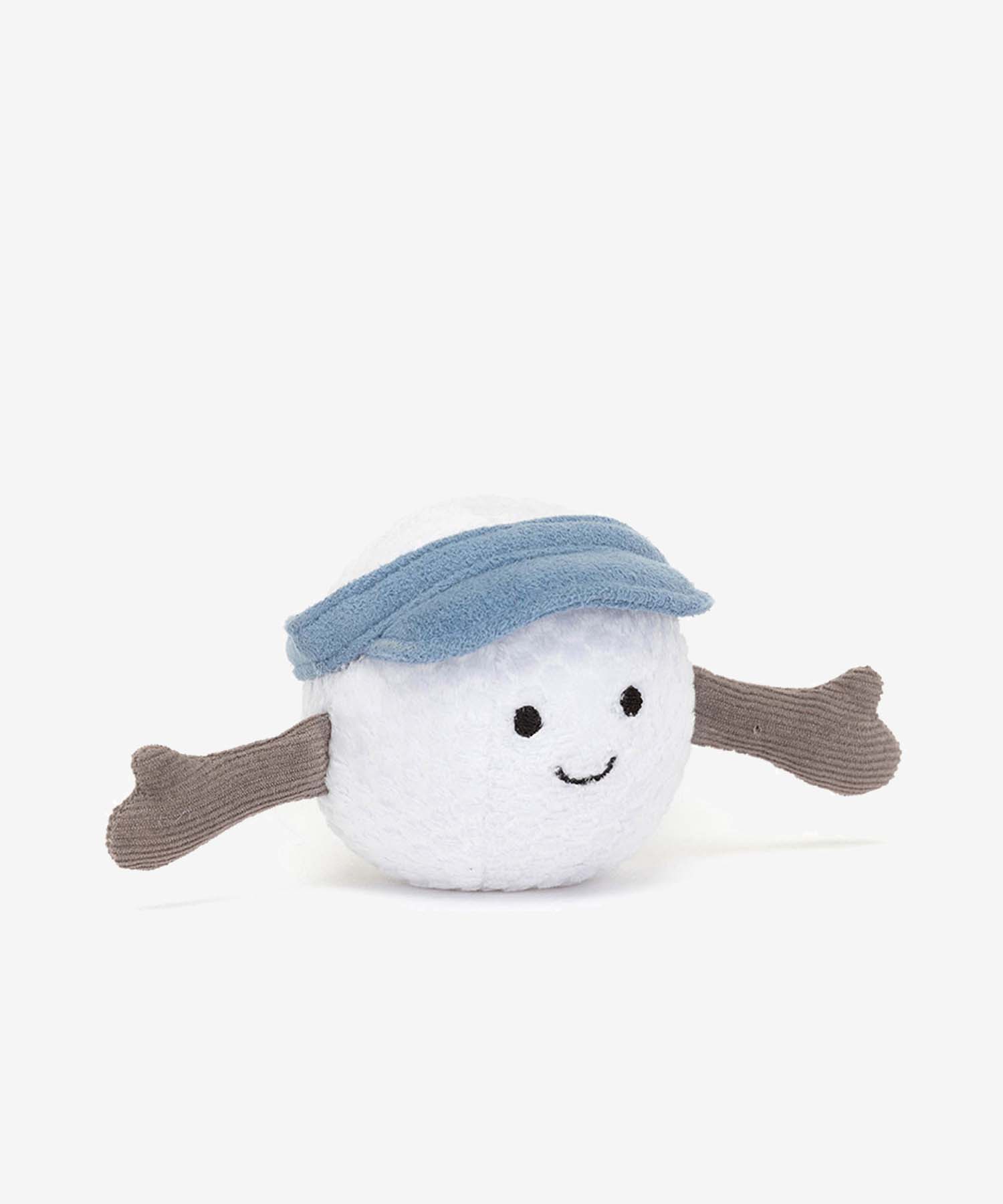 Pluszowa piłka golfowa z uśmiechniętą buźką, daszkiem i sztruksowymi rączkami.
