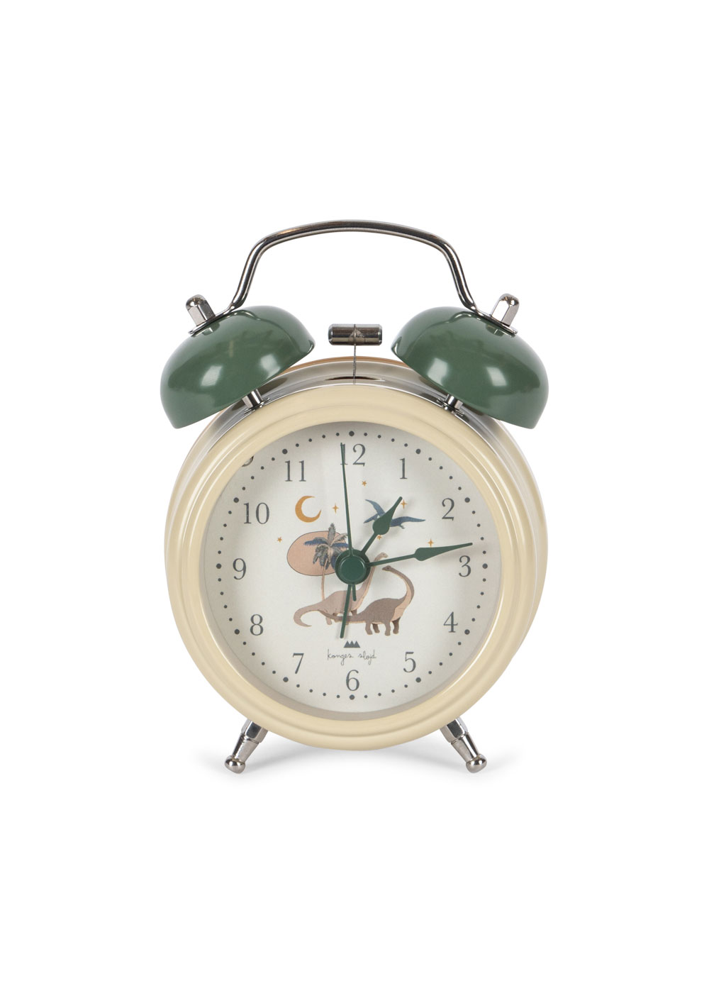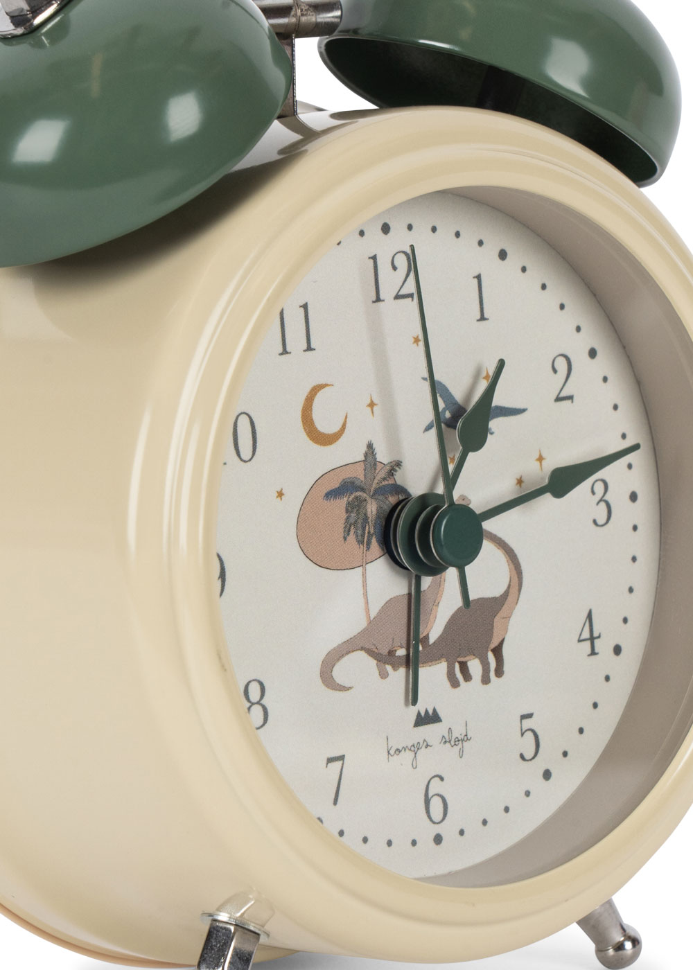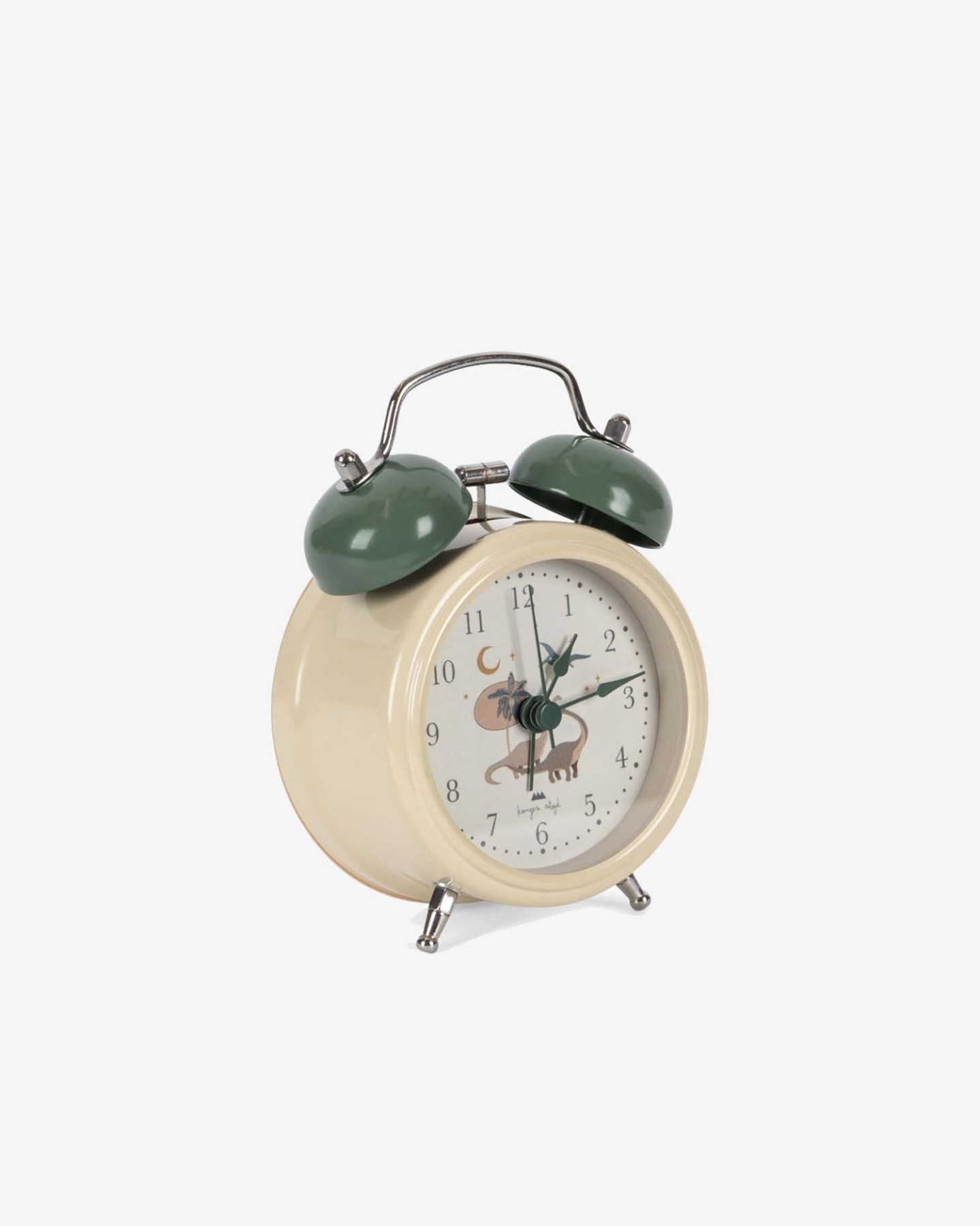 Uroczy budzik dziecięcy od Konges Slojd, wykonany w klasycznym stylu retro, ozdobiony motywem dinozaurów.