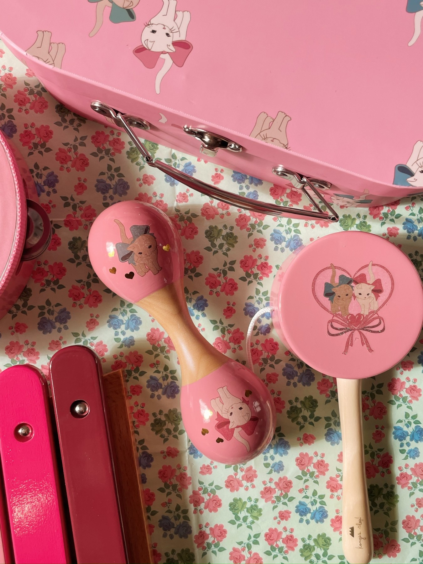 W skład zestawu wchodzą tamburyn, kastaniety, marakas oraz ksylofon z pałeczkami, wszystko zapakowane w poręczną walizeczkę.