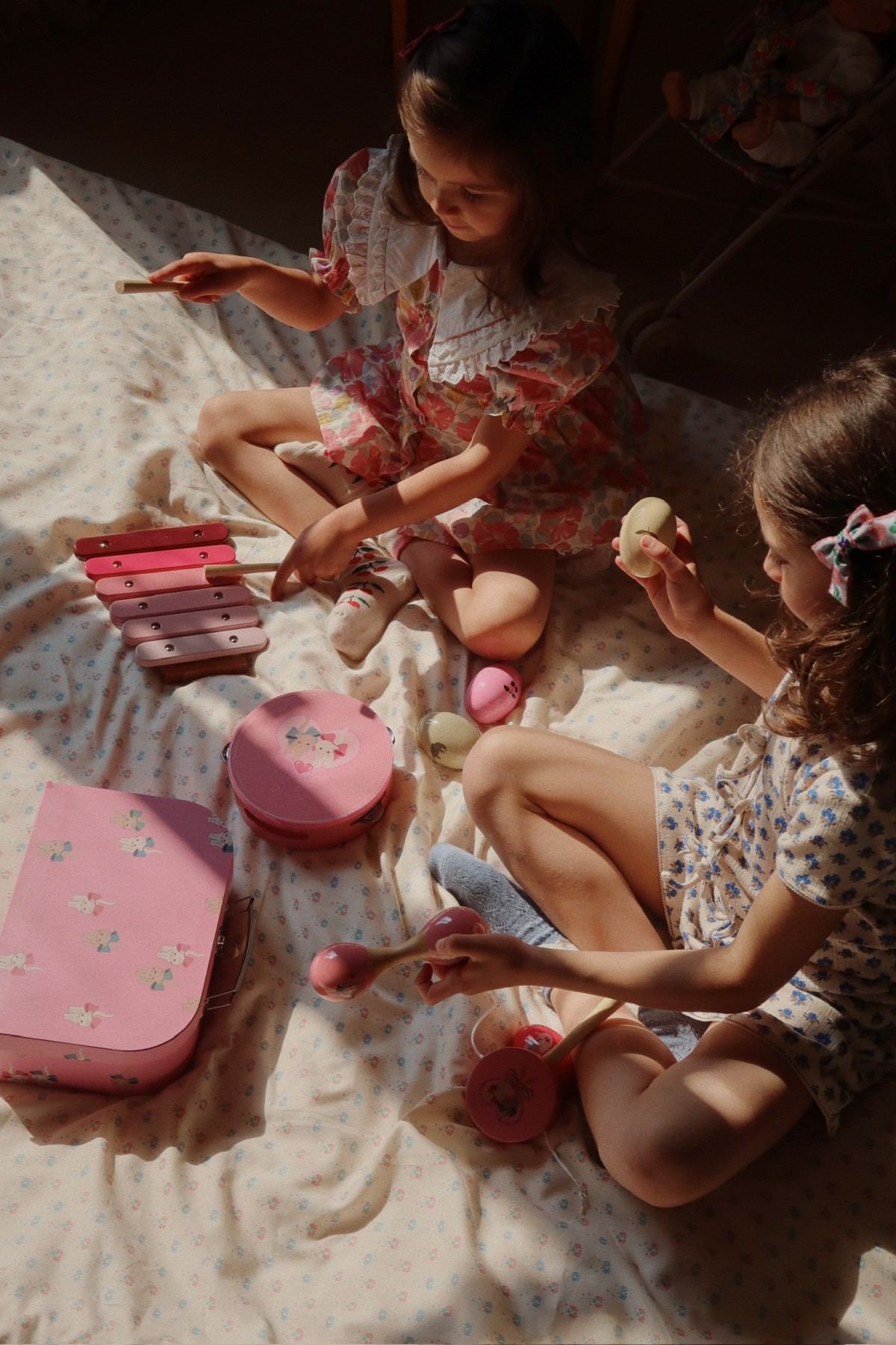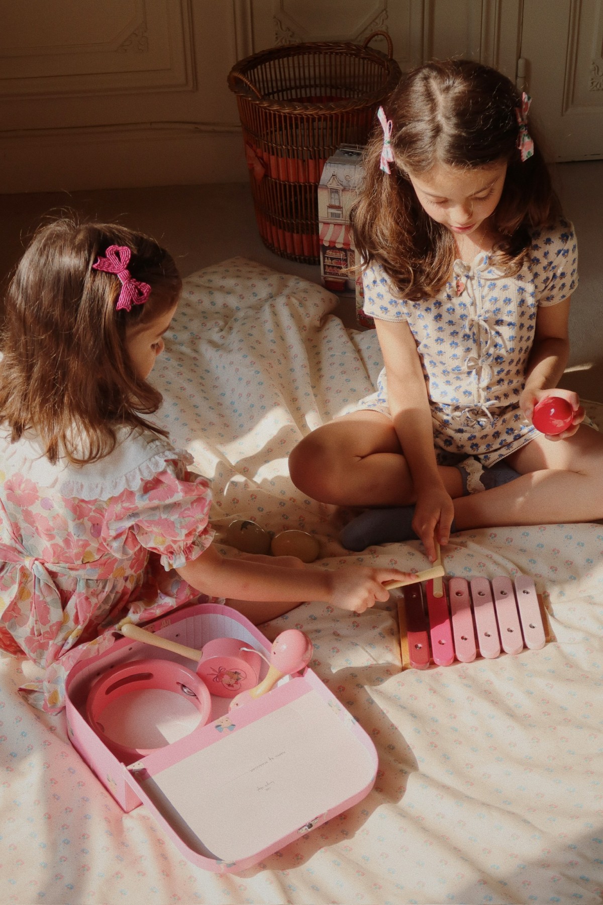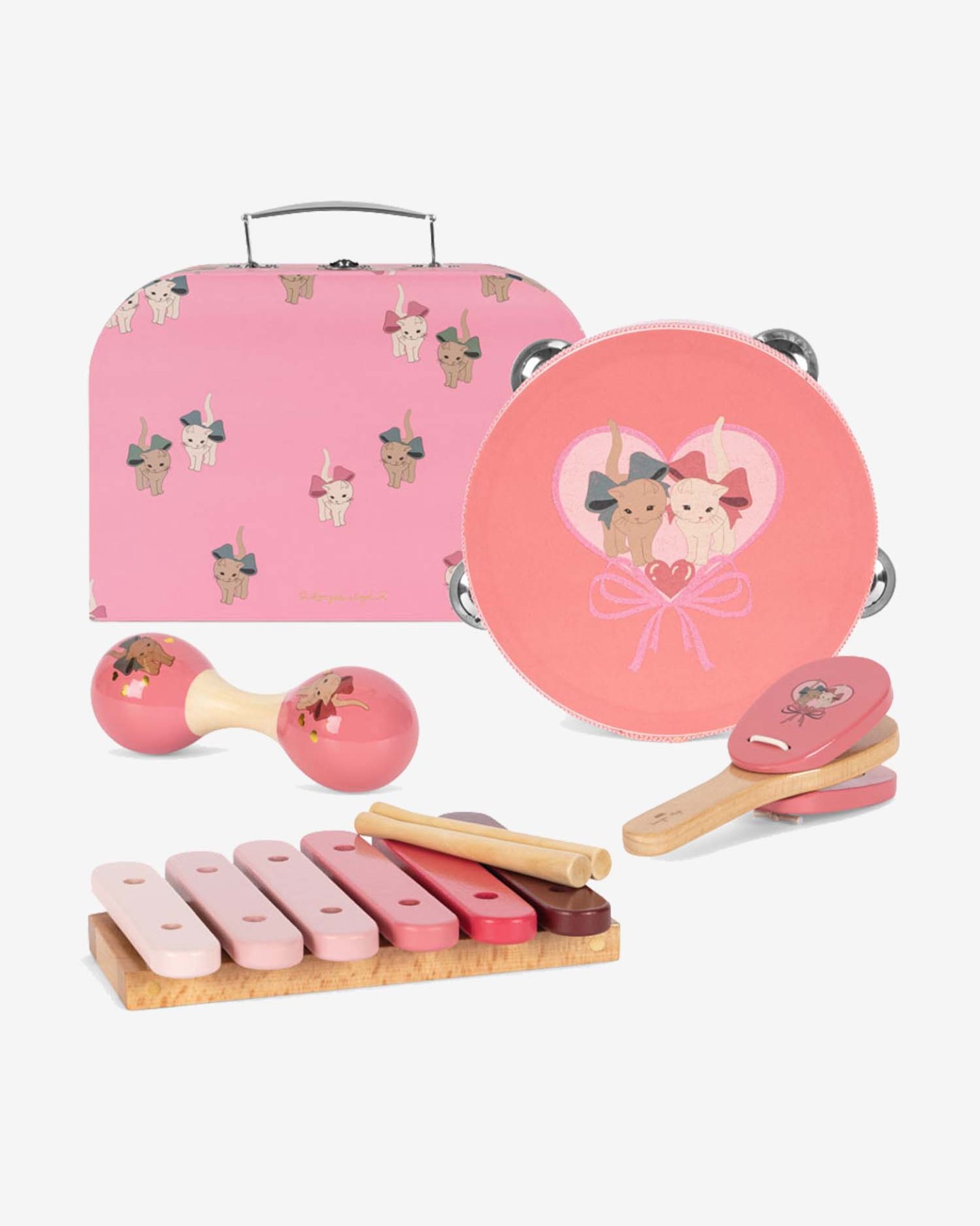 Drewniany zestaw muzyczny z nadrukiem w kotki od Konges Sløjd.