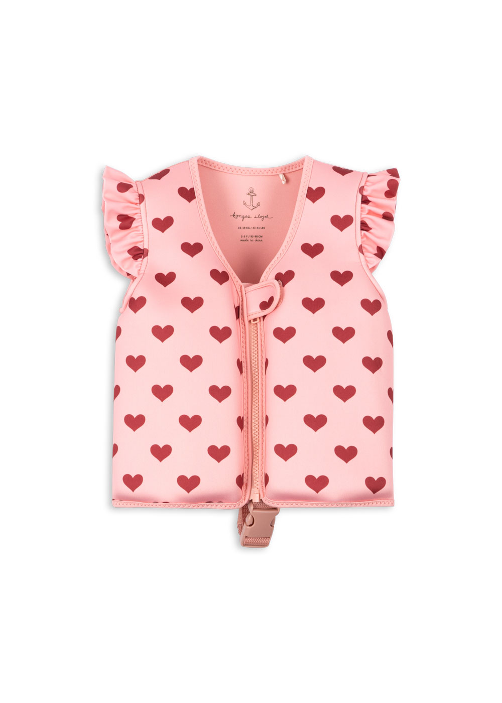 Kamizelka wypornościowa do nauki pływania z kolekcji letniej Konges Sløjd. Wykonana z materiału w różowym odcieniu z uroczym nadrukiem w serduszka.