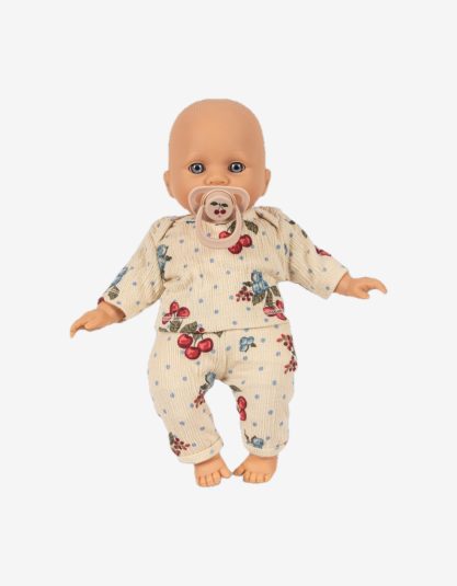 Tara ubrana jest w miękki, dwuczęściowy bawełniany komplet i ma swój uspokajający smoczek. Całość zapakowana jest w estetyczne, dekoracyjne pudełko – idealne również na prezent.