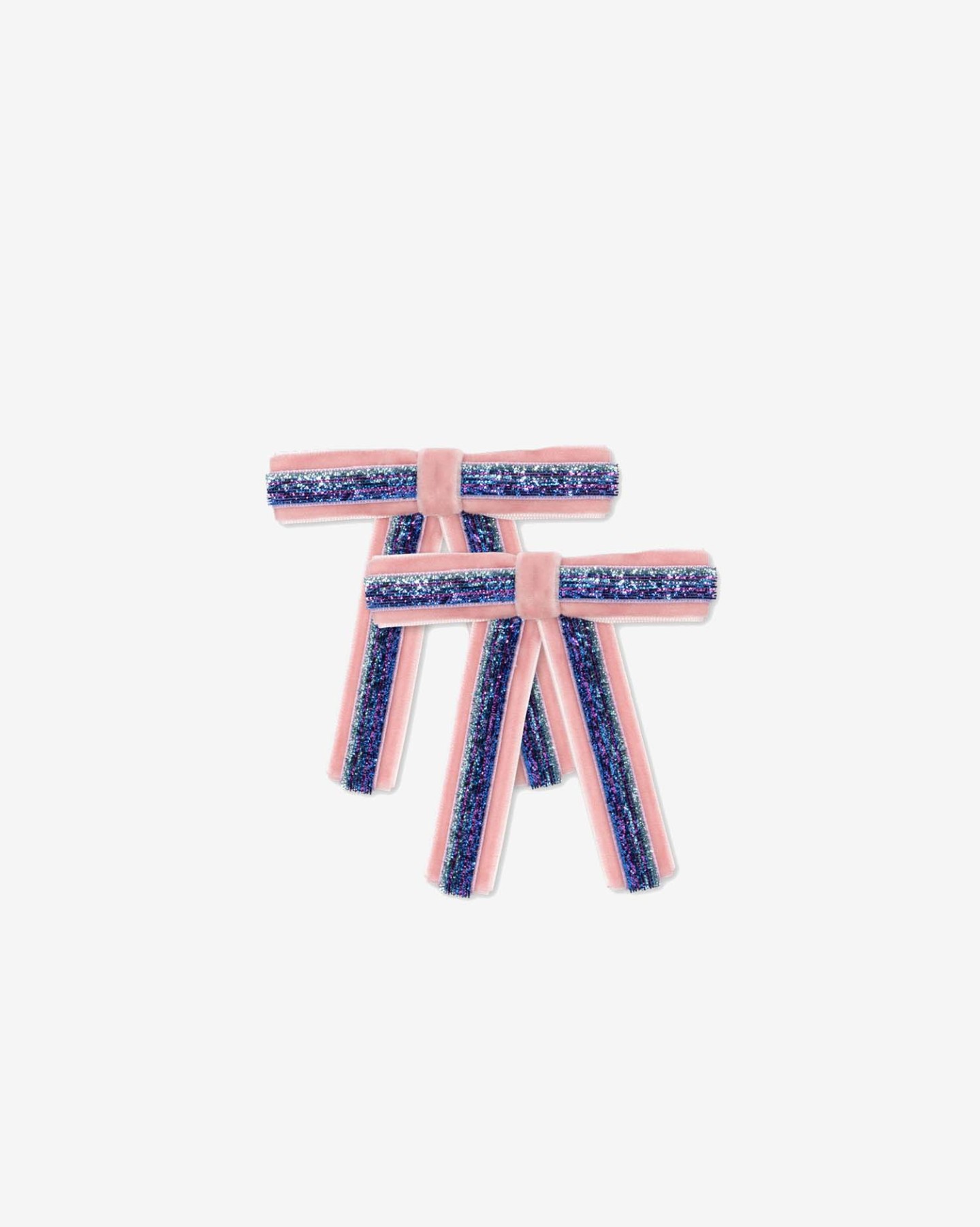Spinki do włosów Velvet Bow od Konges Sløjd. Wykonane z aksamitnej tkaniny, ozdobione brokatowymi paskami w odcieniach różu i niebieskiego, dodają uroku każdej fryzurze.