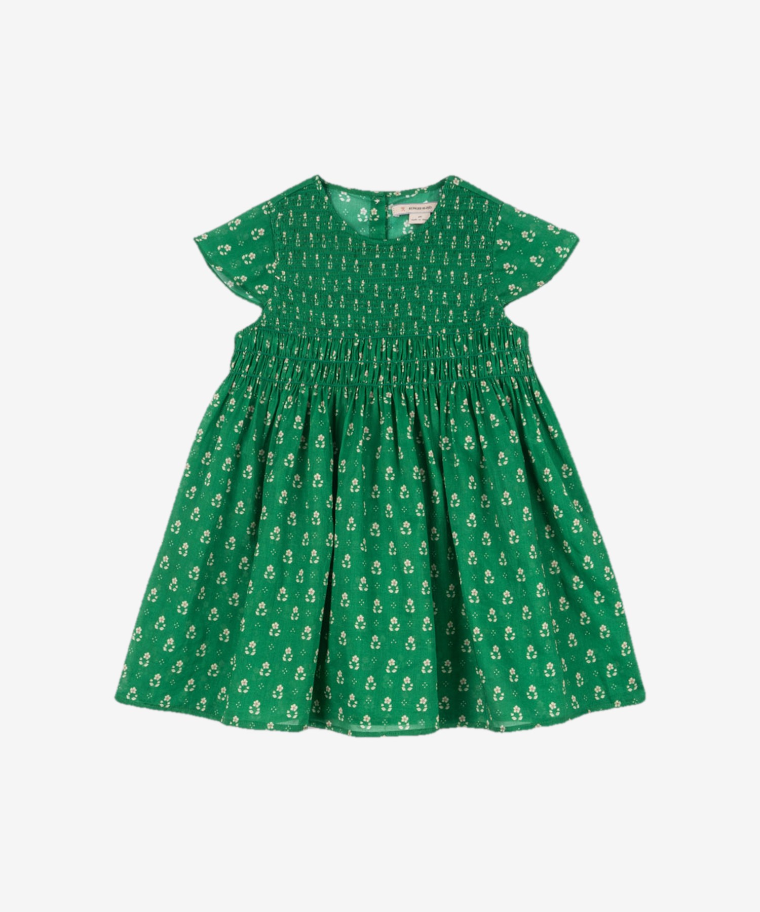 Lekka, letnia sukienka z delikatnej bawełny organicznej o przewiewnej strukturze. Góra z marszczeniem typu smock zapewnia wygodne dopasowanie i swobodę ruchów, a rozkloszowany dół tworzy miękką, dziewczęcą linię.