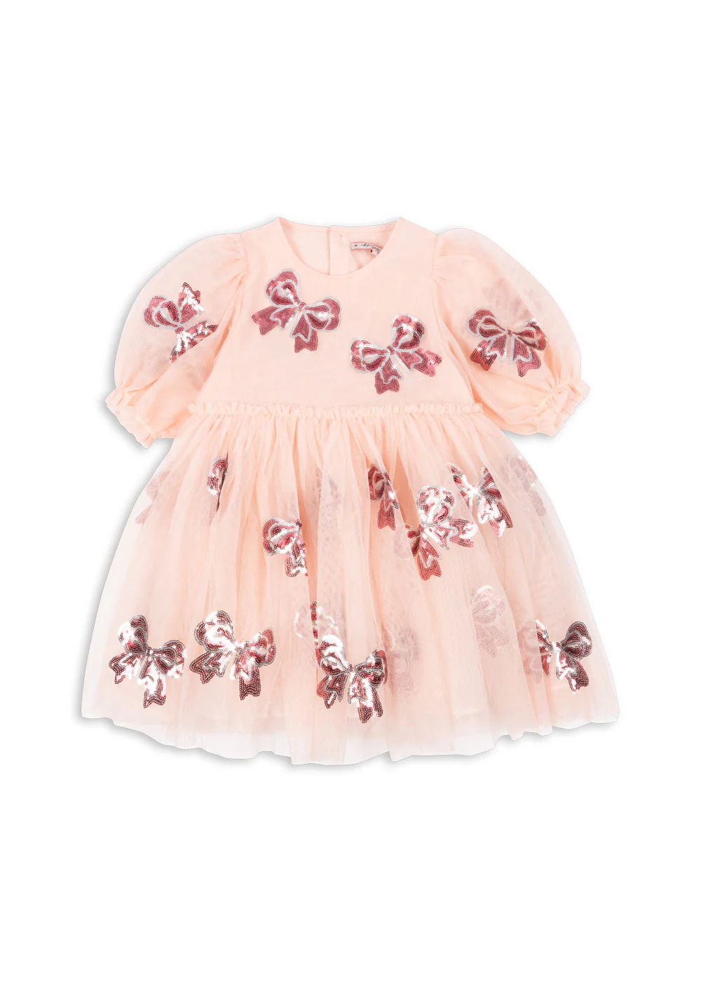 Zjawiskowa sukienka z tiulu ozdobiona błyszczącymi kokardkami z cekinów. Bufiaste rękawy i lekko rozkloszowany dół dodają jej wyjątkowego uroku. Zapinana z tyłu na guziczek. Idealna na wyjątkowe okazje.