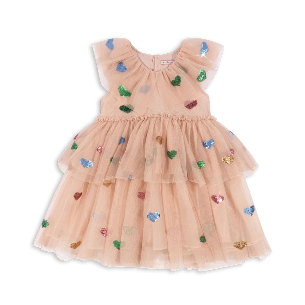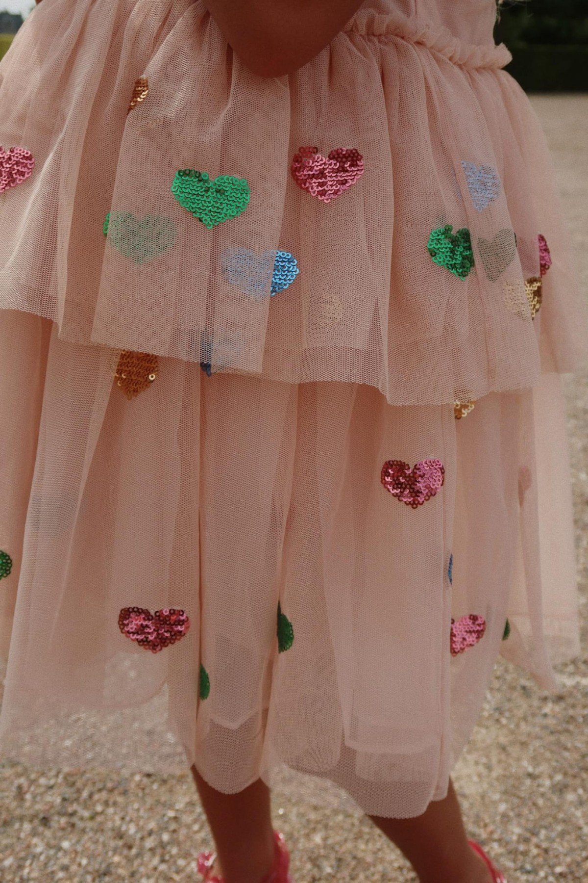 Warstwowa sukienka od Konges Sløjd uszyta z delikatnego tiulu, ozdobiona błyszczącymi serduszkami w wielu kolorach. Zwiewne rękawki, falbany i lekko rozkloszowany krój tworzą bajkowy efekt – idealny na urodziny, przyjęcia i wszystkie wyjątkowe okazje.