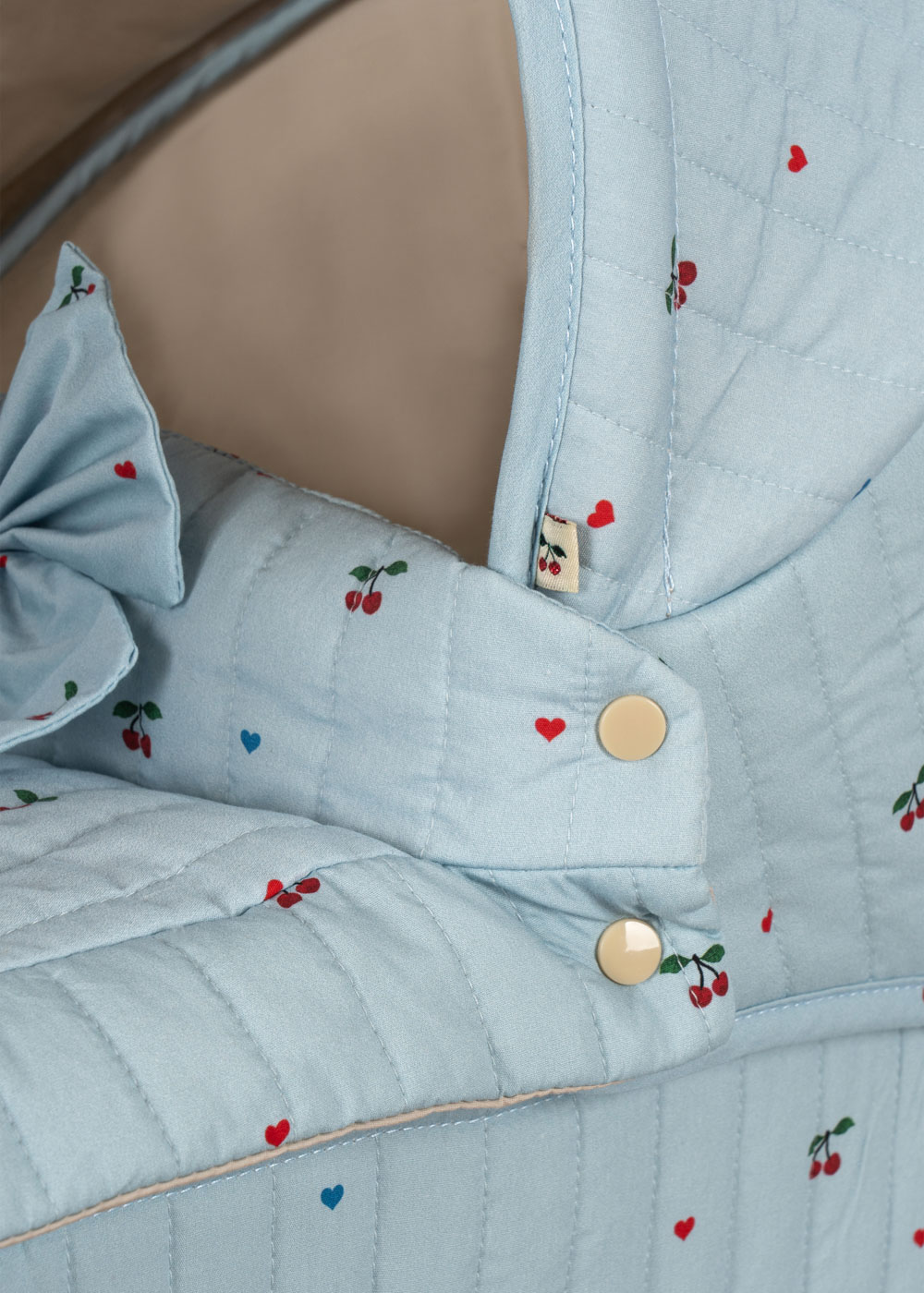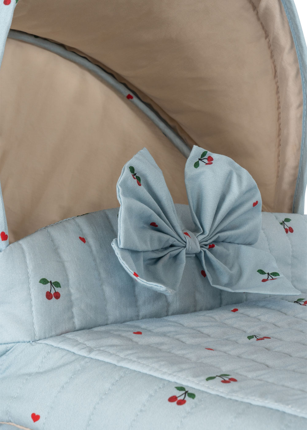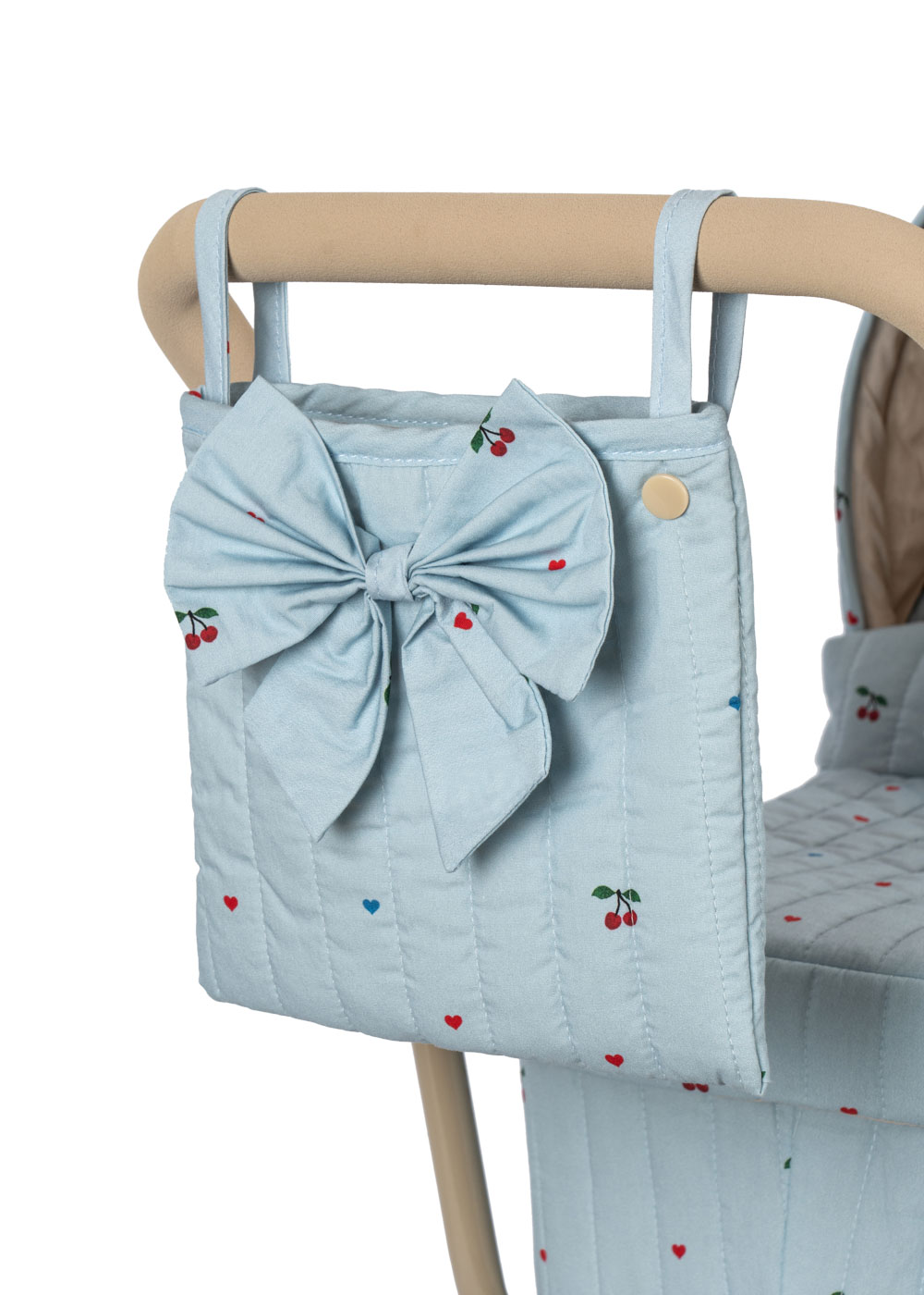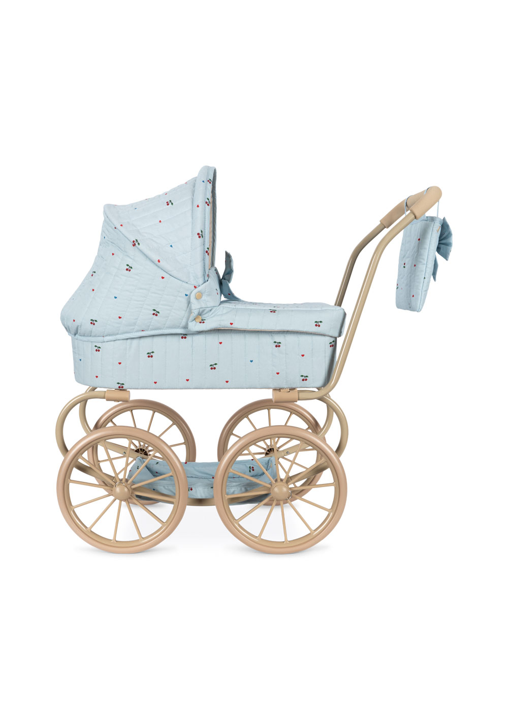 Wózek dla lalek od Konges Sløjd w klasycznym stylu vintage. Z gondolą wyściełaną pikowanym materiałem w delikatny wzór wisienek, wygląda jak prawdziwy.