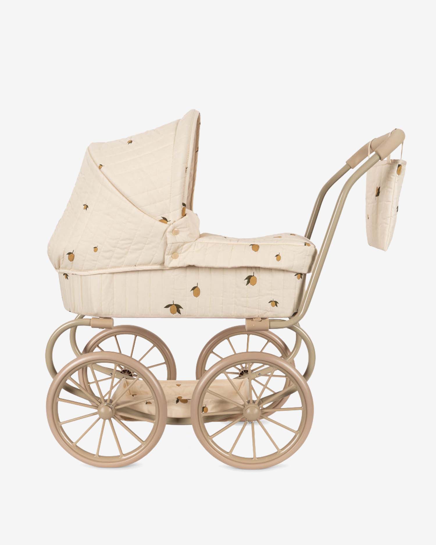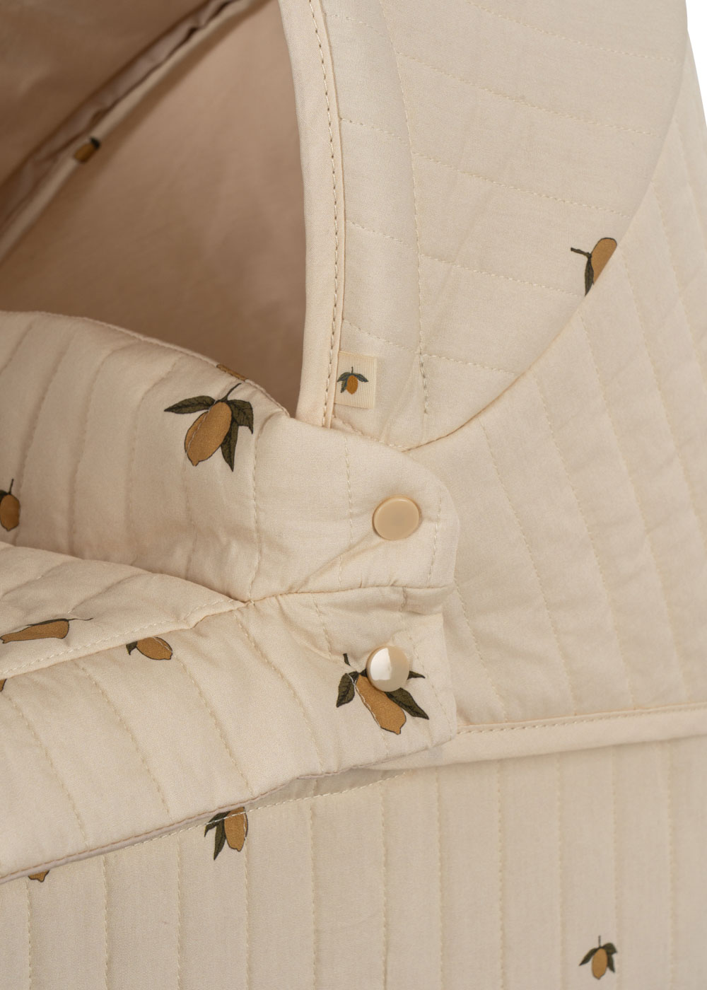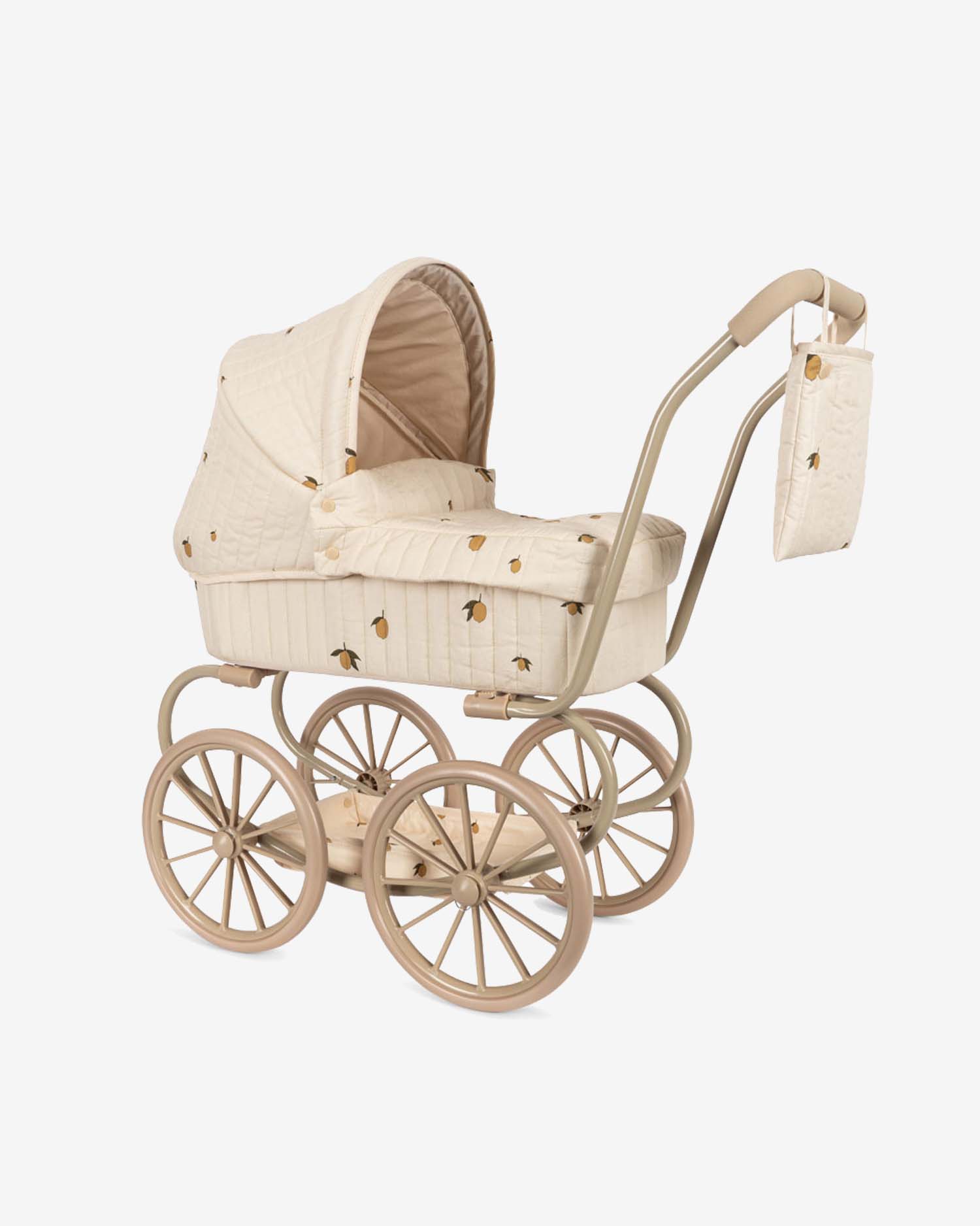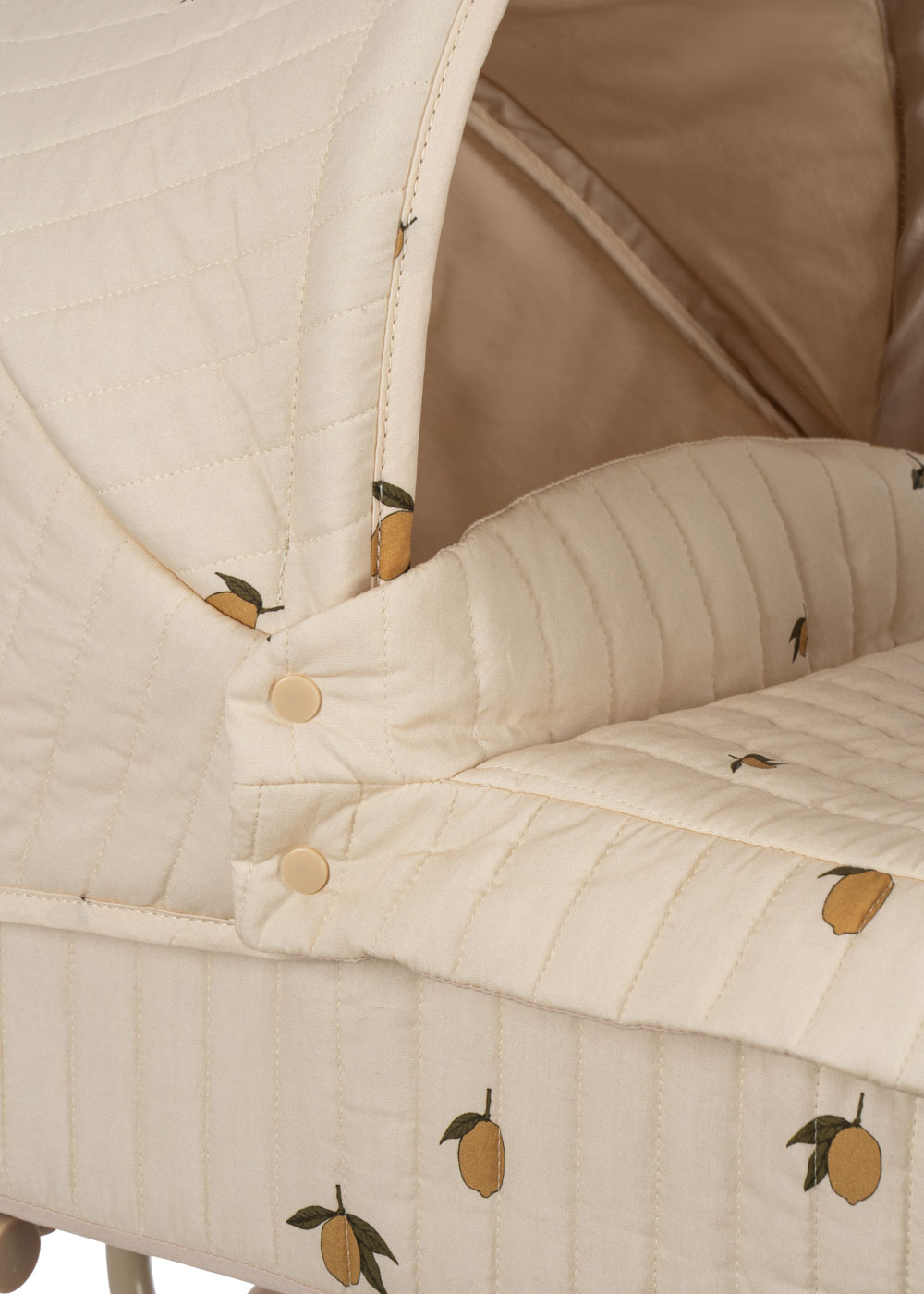 Zaprojektowany z czterema dużymi kołami, które zapewniają łatwe i stabilne poruszanie się, pikowanym materiałem z nadrukiem w cytrynki i delikatnymi krawędziami w kształcie muszelki.