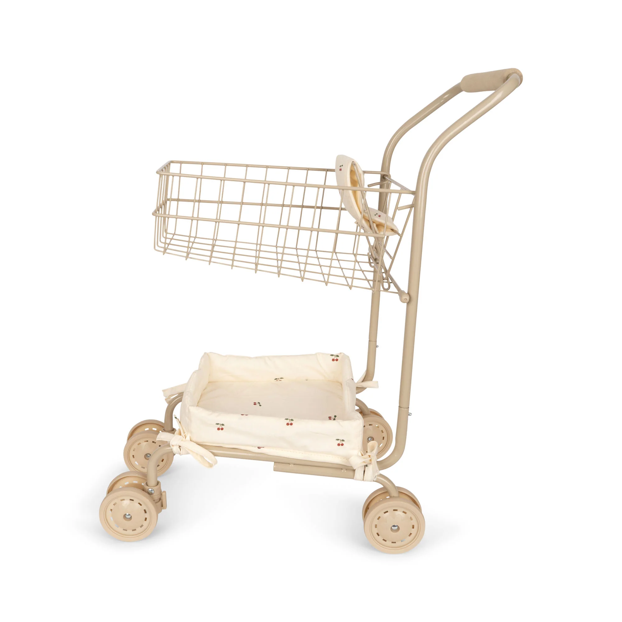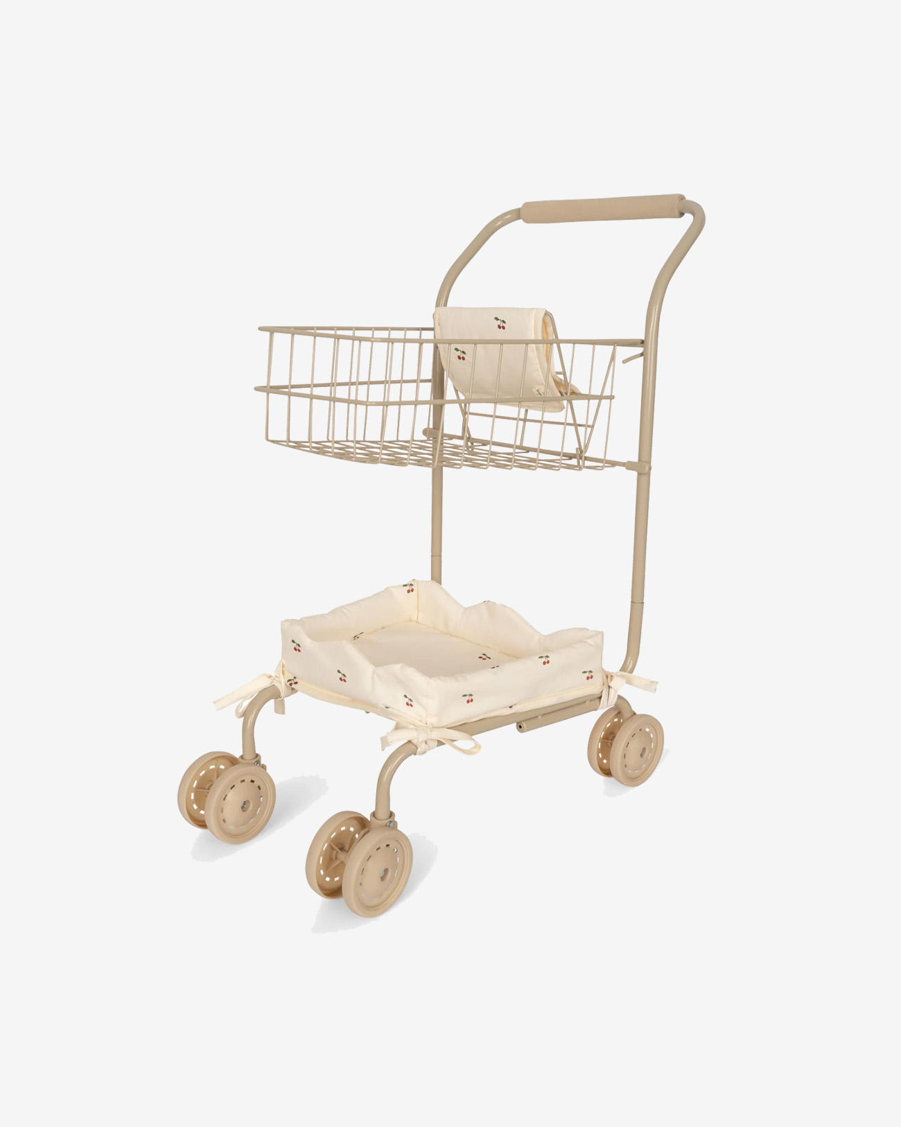 Wózek do zabawy w sklep w stylu vintage. Zaprojektowany z pikowanej tkaniny z nadrukiem w wisienki.