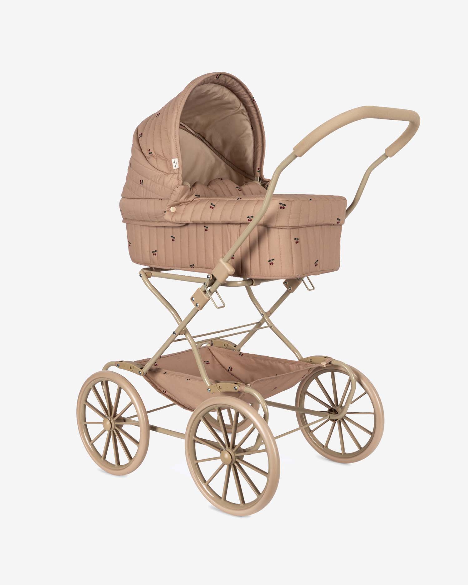 Wózek dla lalek Konges Sløjd w stylu vintage z czterema dużymi kołami, dzięki którym prowadzenie jest łatwe i stabilne. Zaprojektowany z pikowanej tkaniny z nadrukiem w wisienki.