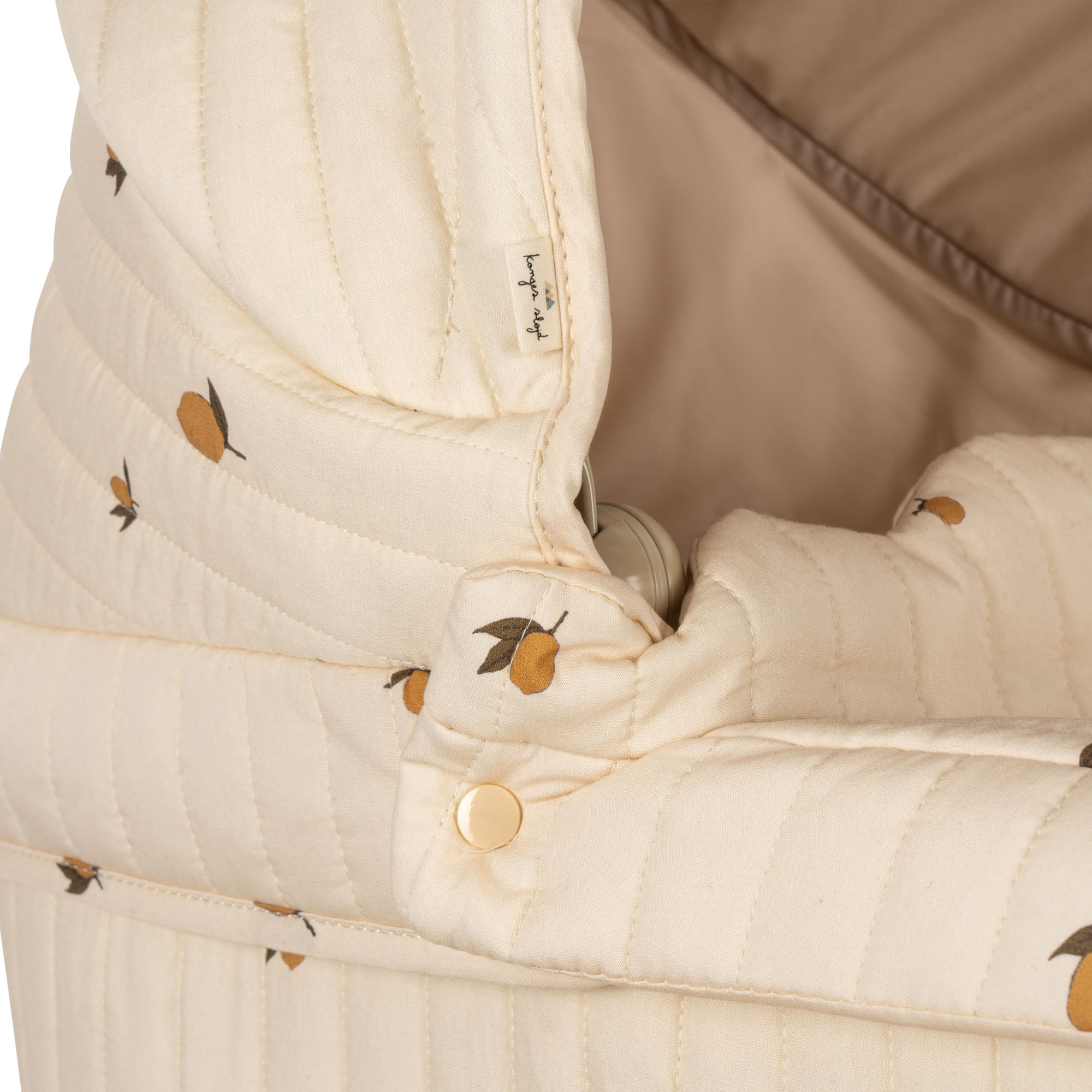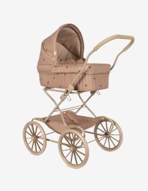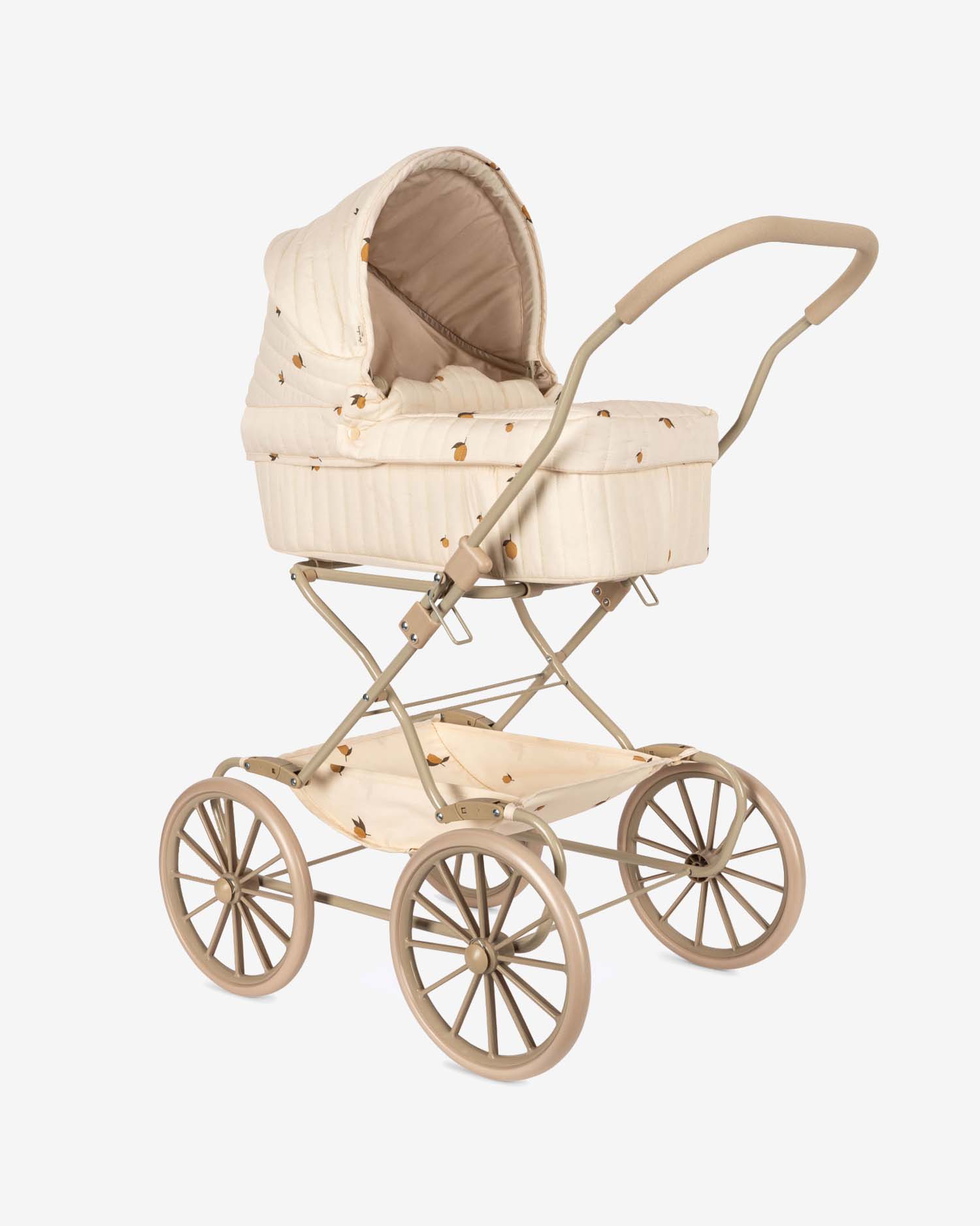 Wózek dla lalek Konges Sløjd w stylu vintage z czterema dużymi kołami, dzięki którym prowadzenie jest łatwe i stabilne. Zaprojektowany z pikowanej tkaniny z nadrukiem w cytrynki.