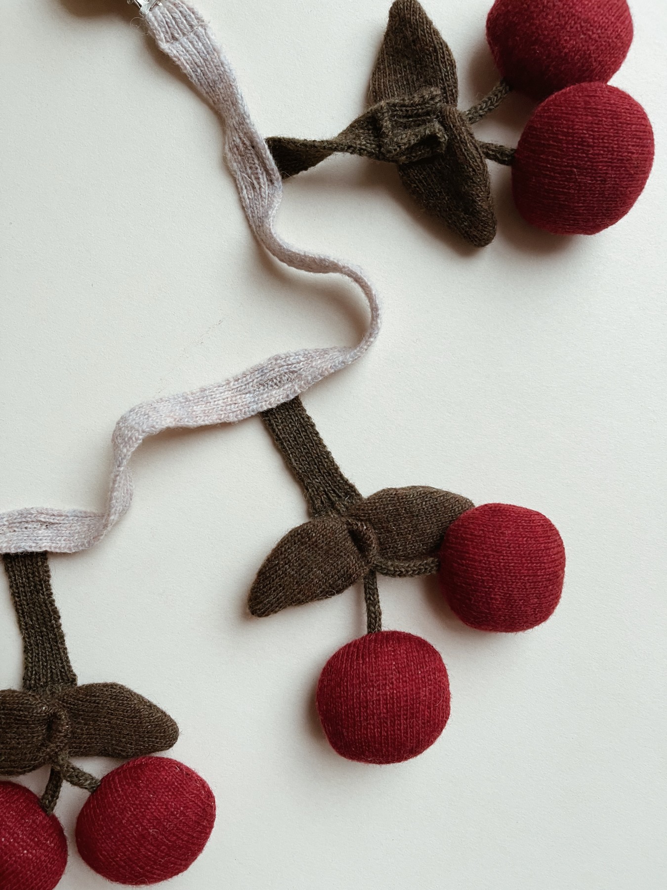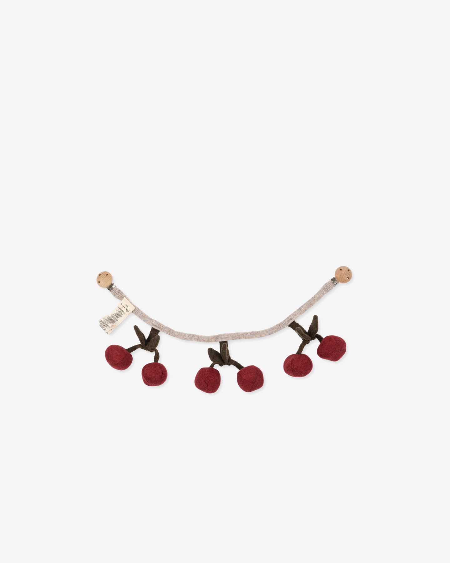 Łańcuszek do wózka z drewnianymi klipsami po obu stronach i zawieszkami w kształcie wisienek od duńskiej marki Konges Sløjd.