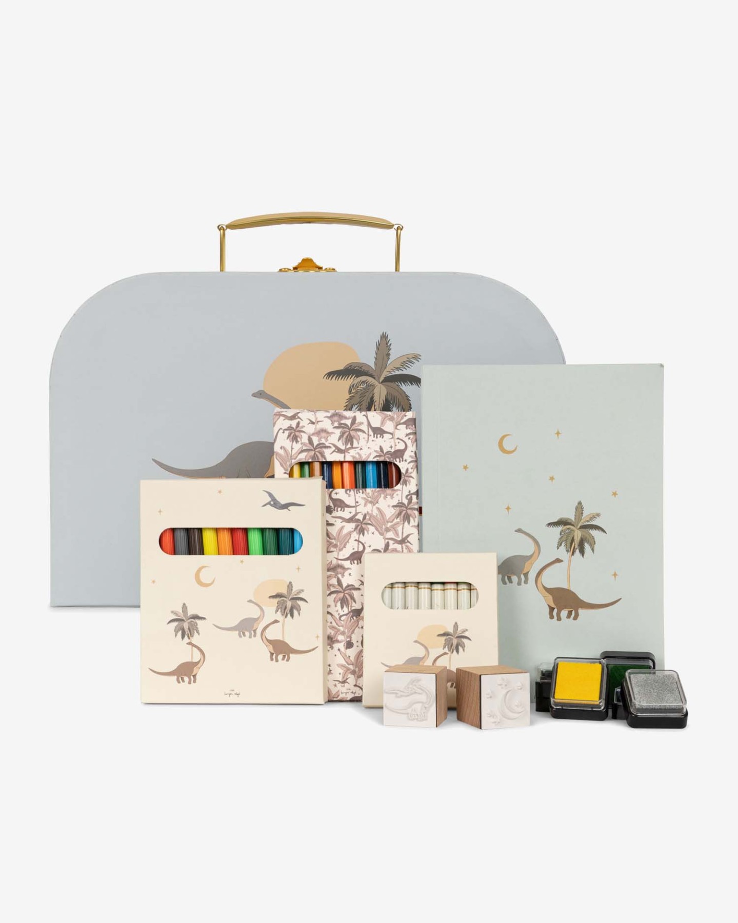 W eleganckiej walizeczce znajdują się kredki, flamastry, pieczątki z motywami dinozaurów, kolorowe tusze oraz zeszyt do rysowania. Wszystkie elementy wykonane są z bezpiecznych materiałów, a ich design zachwyca dbałością o szczegóły.