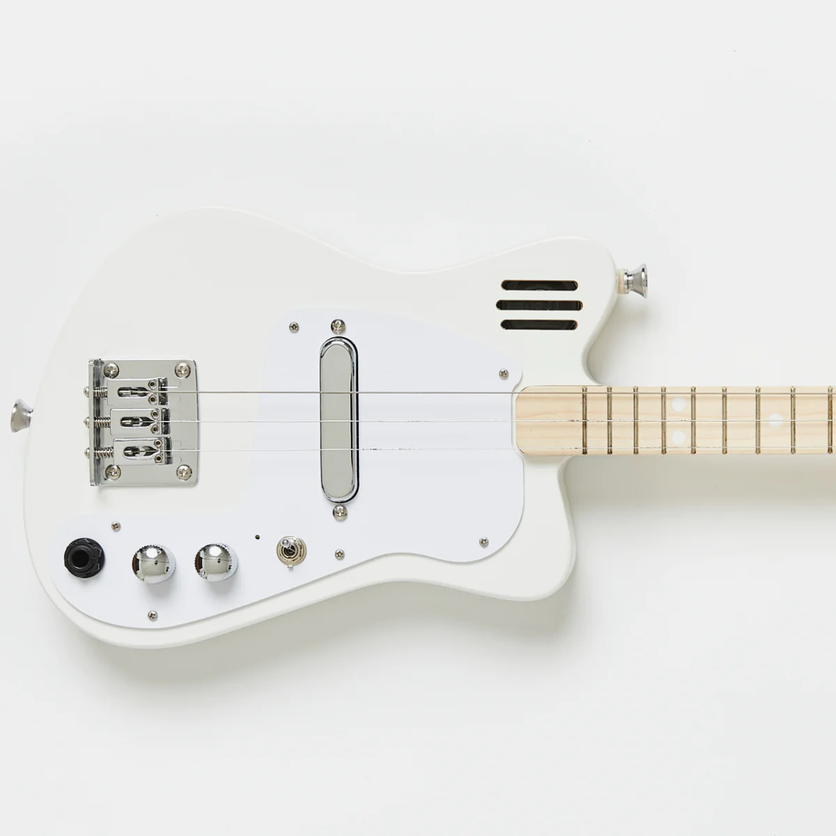 Mała 3-strunowa gitara elektryczna dla dzieci, która pomimo swoich małych rozmiarów brzmi jak prawdziwy instrument.