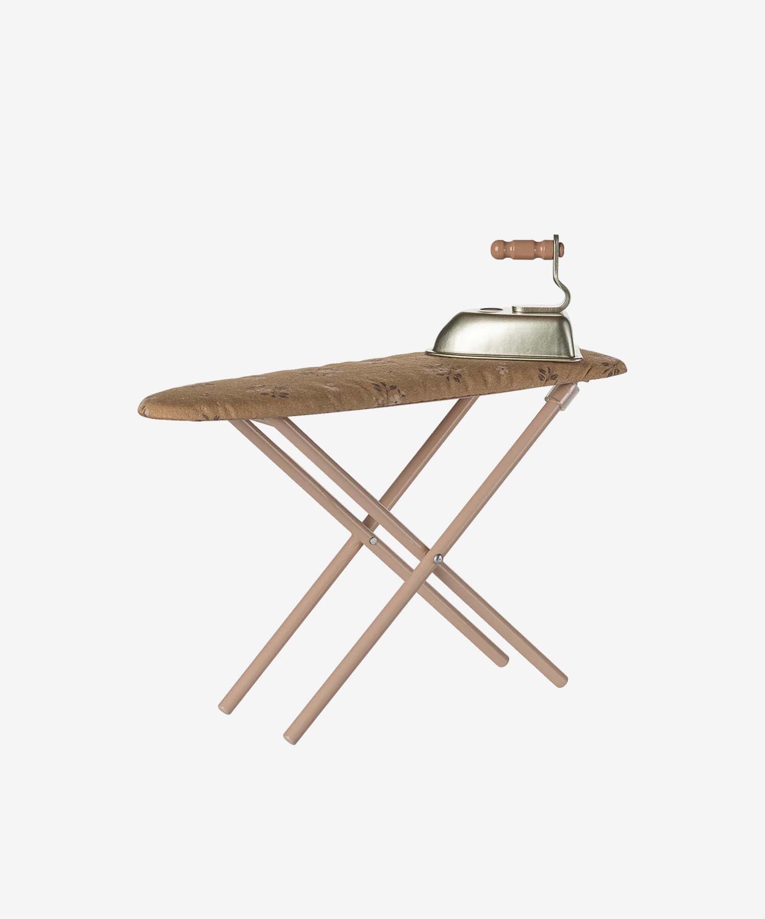 Metalowa deska do prasowania z uroczym materiałowym pokrowcem i miniaturowym żelazkiem tworzy realistyczny kącik pralni w domku Maileg.