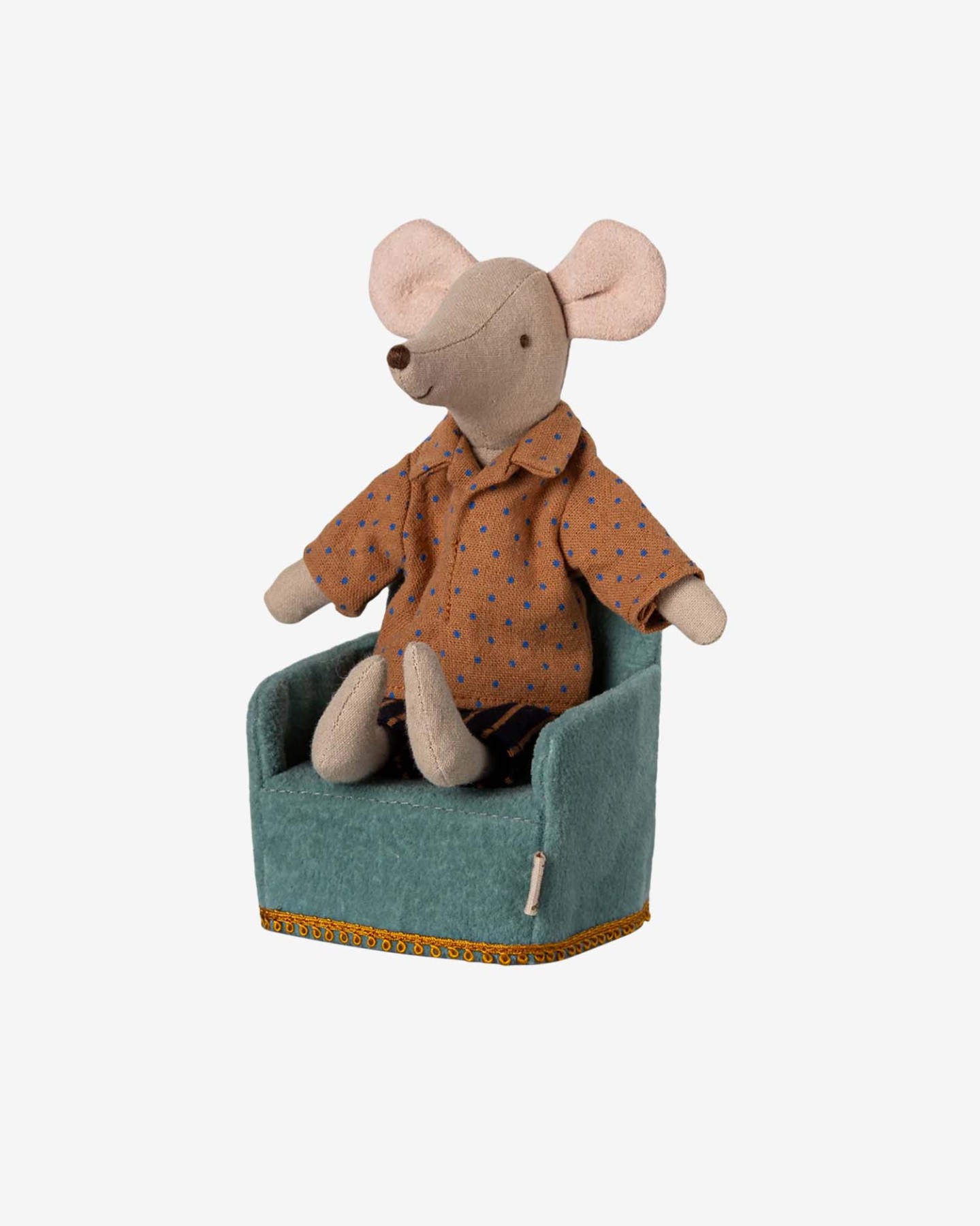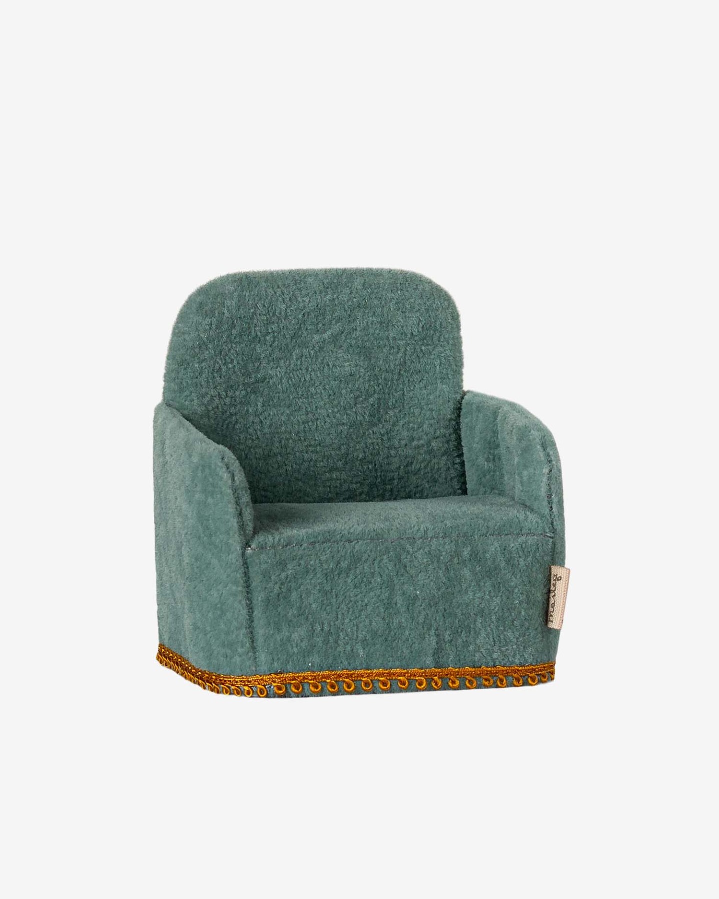 Fotel z najnowszej kolekcji SS25 od Maileg to stylowy dodatek do mysiego domku. Wykonany z miękkiego materiału w odcieniu miętowej zieleni, ma eleganckie wykończenie i klasyczny design, który pasuje do każdej aranżacji.