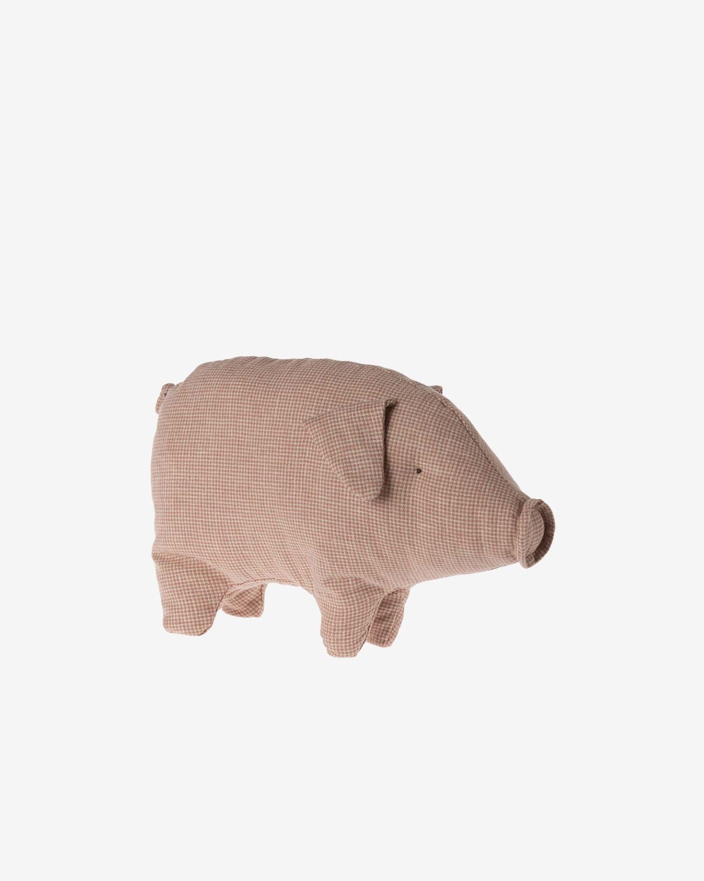 Urocza przytulanka świnka wykonana z lniano-bawełnianego materiału w kratę vichy. Może służyć również jako poduszka.