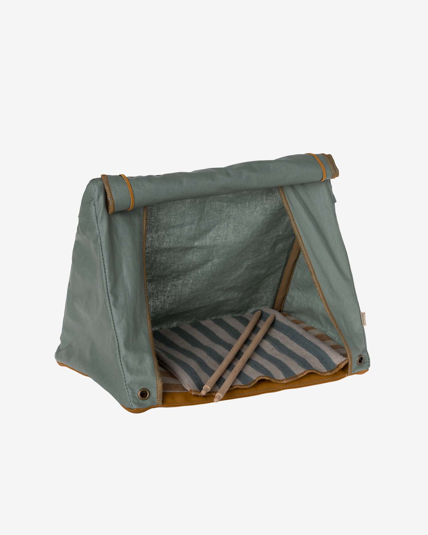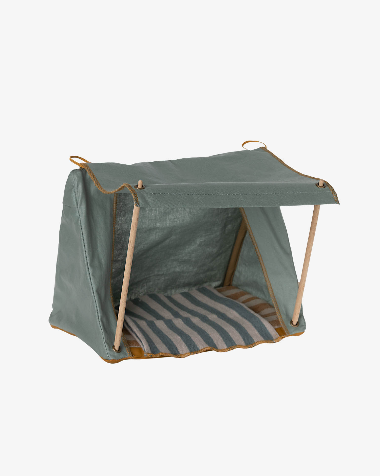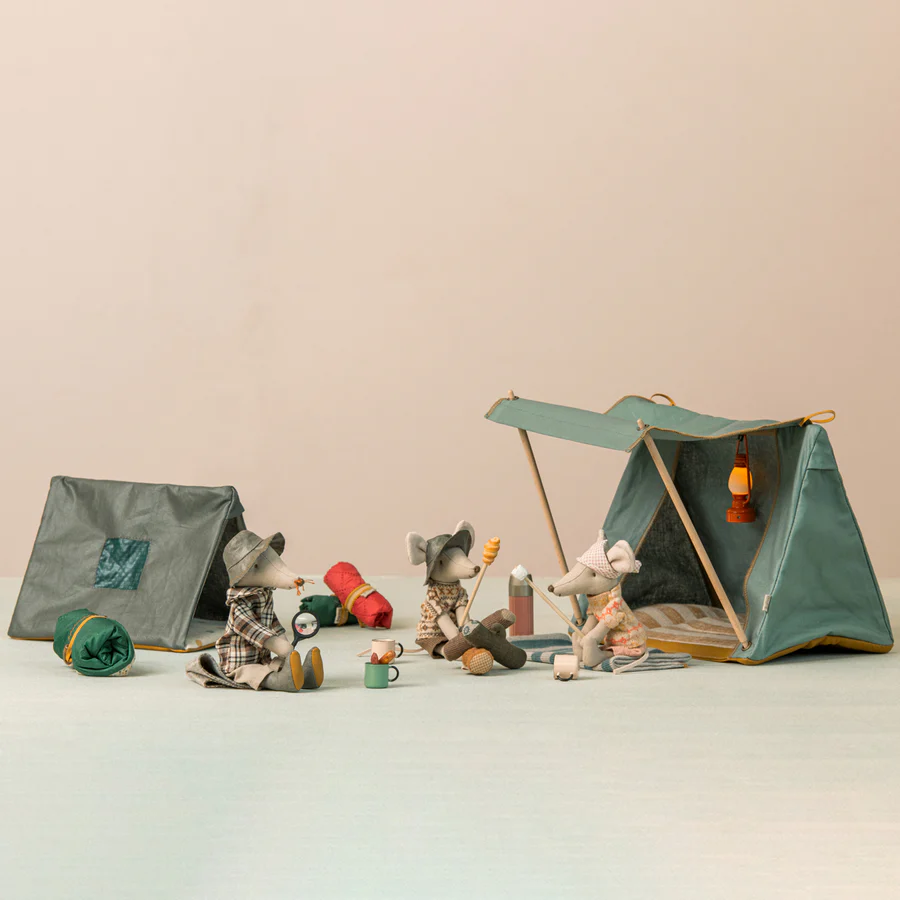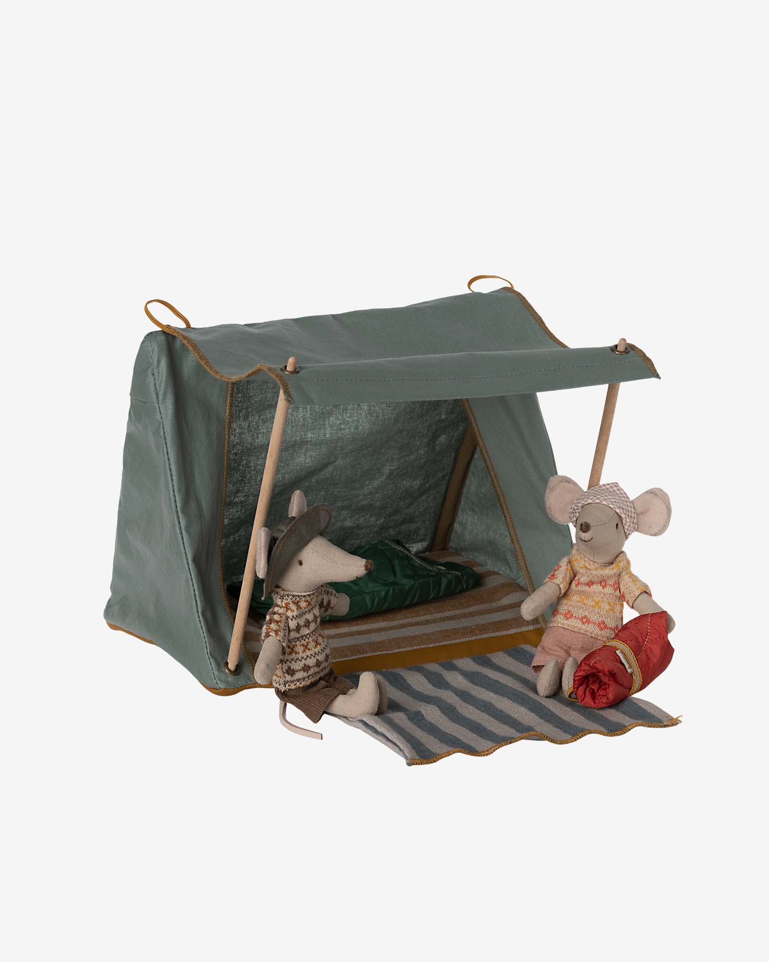 Zabierz myszki maileg na nocleg w składanym namiocie. Koc zapewni Twoim przyjaciołom ciepło, a drewniane patyki podtrzymają drzwi namiotu i zapewnią schronienie przed deszczem. Zewnętrzny materiał ma powlekaną powierzchnię, co zapewnia bardziej autentyczny wygląd.