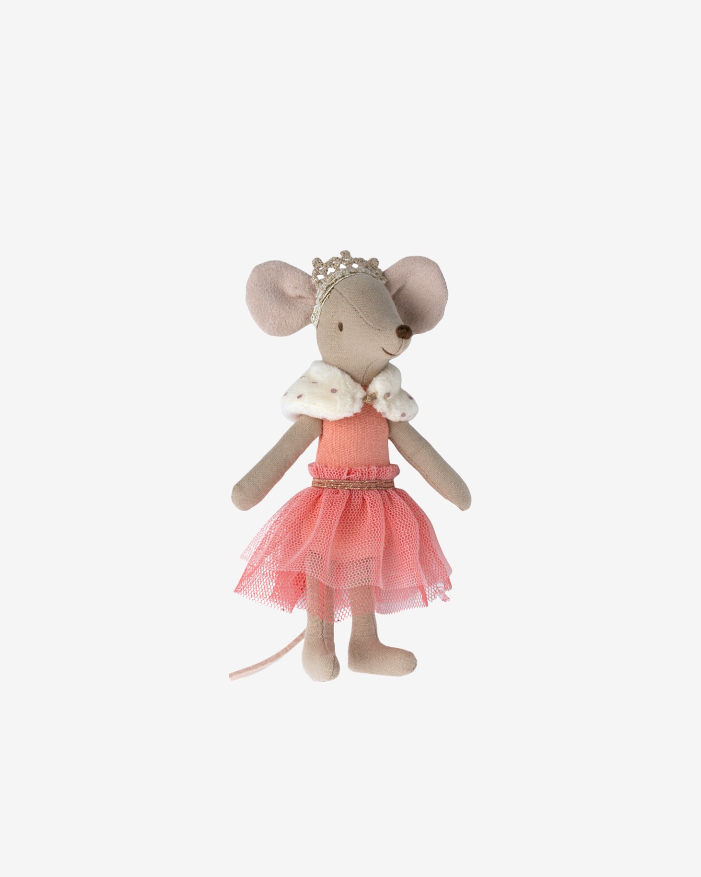 Ubrana jest w różową tiulową sukienkę z pięknymi koronkowymi detalami i złotą koroną. Idealnie pasuje do zamku Maileg oraz innych domków dla lalek.