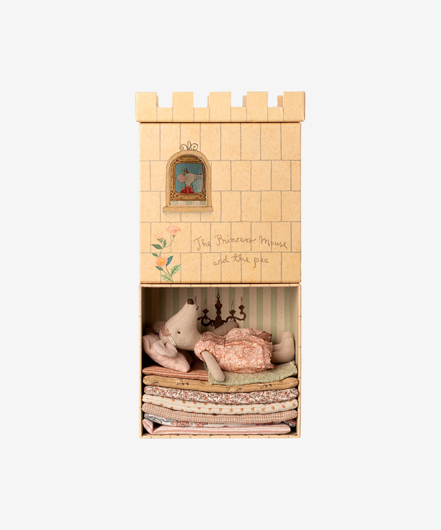 Klasyczny zestaw Maileg inspirowany baśnią „Księżniczka na ziarnku grochu”. Kartonowy zamek kryje 7 miękkich materacy i mały groszek, a w komplecie znajduje się myszka-księżniczka ubrana w jasną, koronkową sukienkę.
