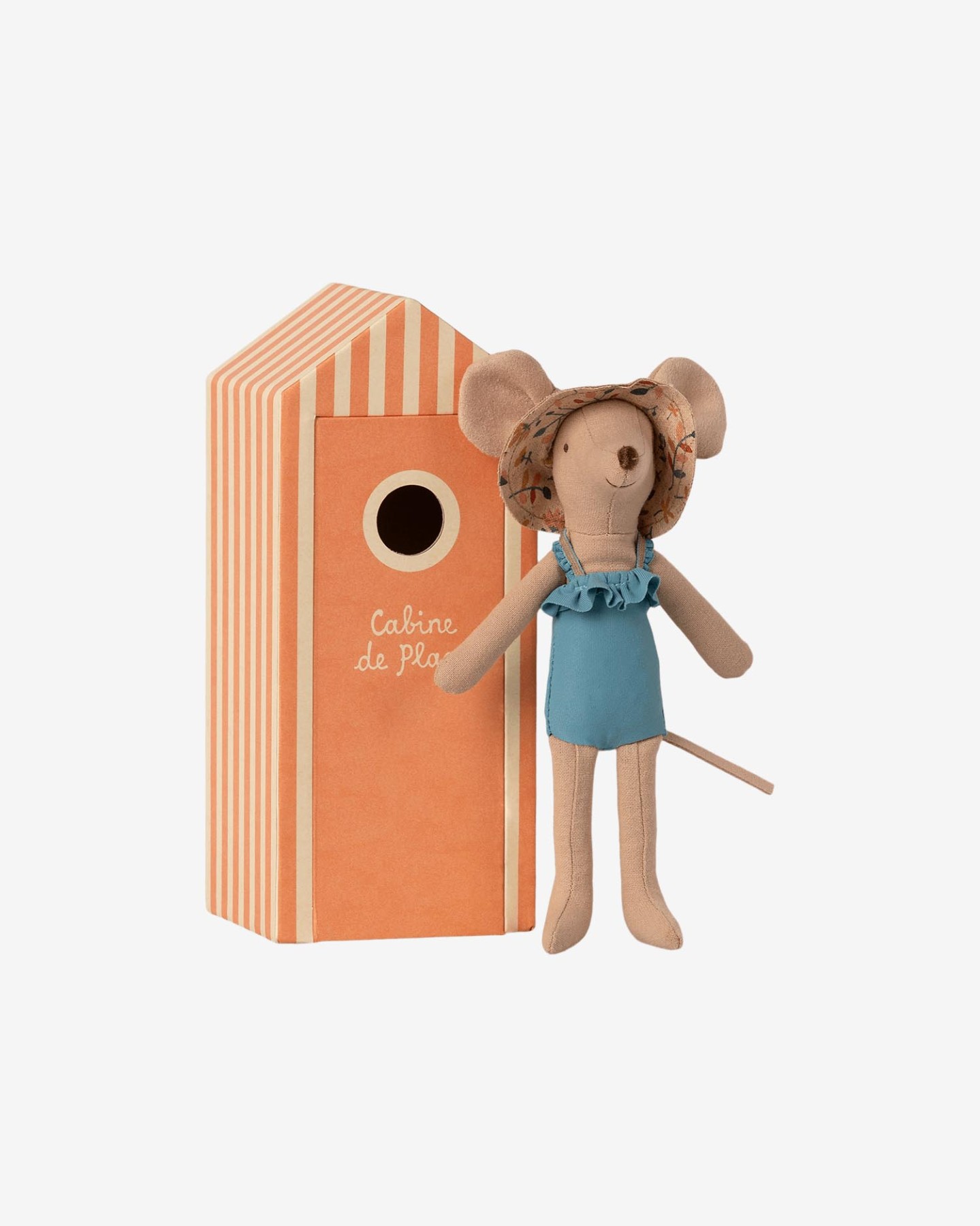Myszka plażowiczka, ubrana w kapelusz i kostium kąpielowy, w zestawie z uroczą kolorową kabiną plażową.