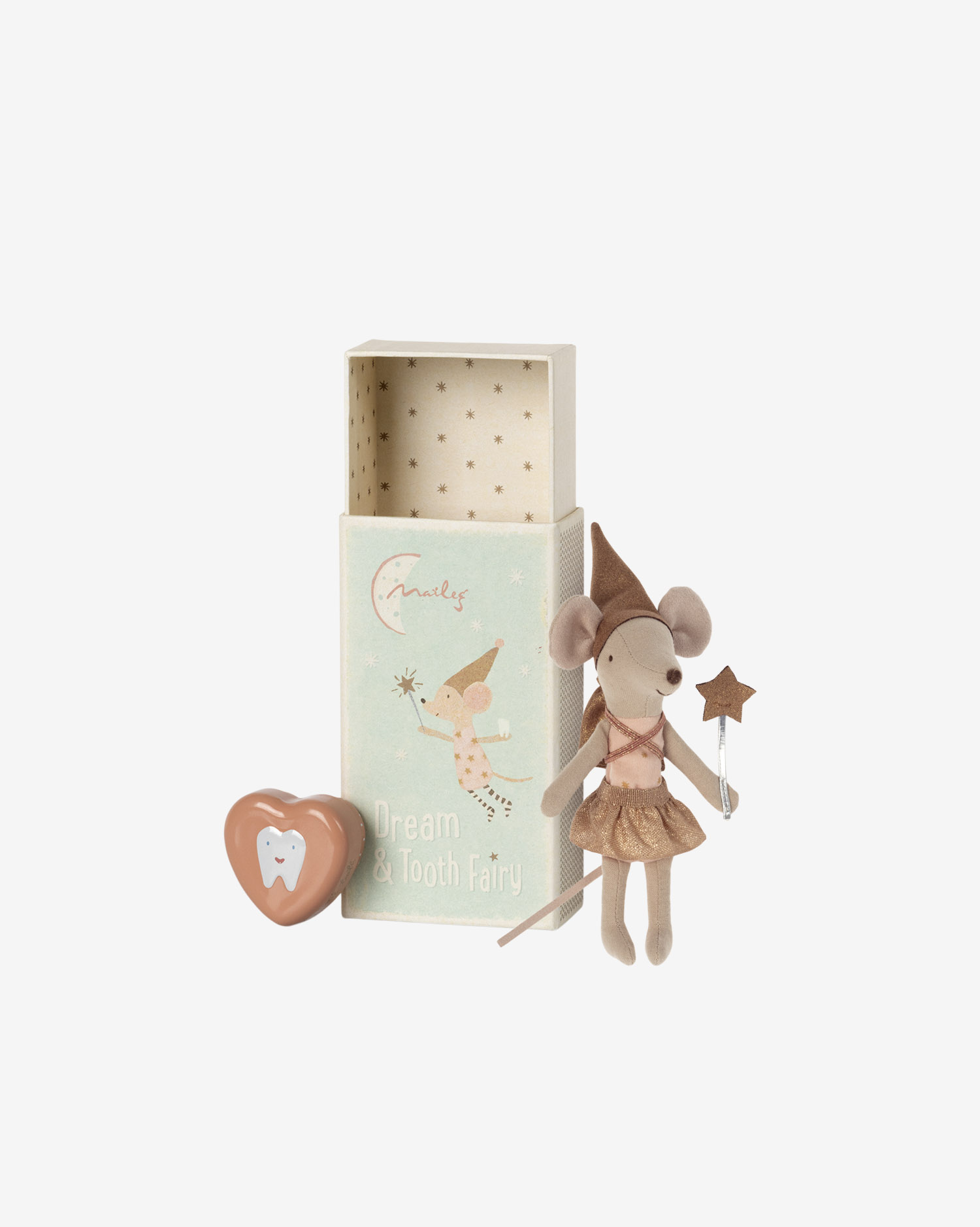 W nocy zębowa wróżka rozsiewa czarodziejski pył, zbiera zęby, przynosi smakołyki i dba o słodkie sny. Ubrana magicznie w spódniczkę tutu, błyszczący kapelusz i złoty plecak. Zestaw zawiera pudełko na zęby i pudełko od zapałek.