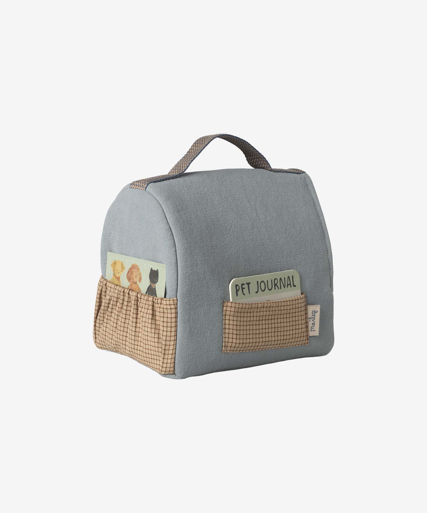 Torba posiada metkę dla zwierzaka (pet ID), dzięki której można podpisać, do kogo należy mały pupil. Pasuje do piesków Maileg z kolekcji Puppy.