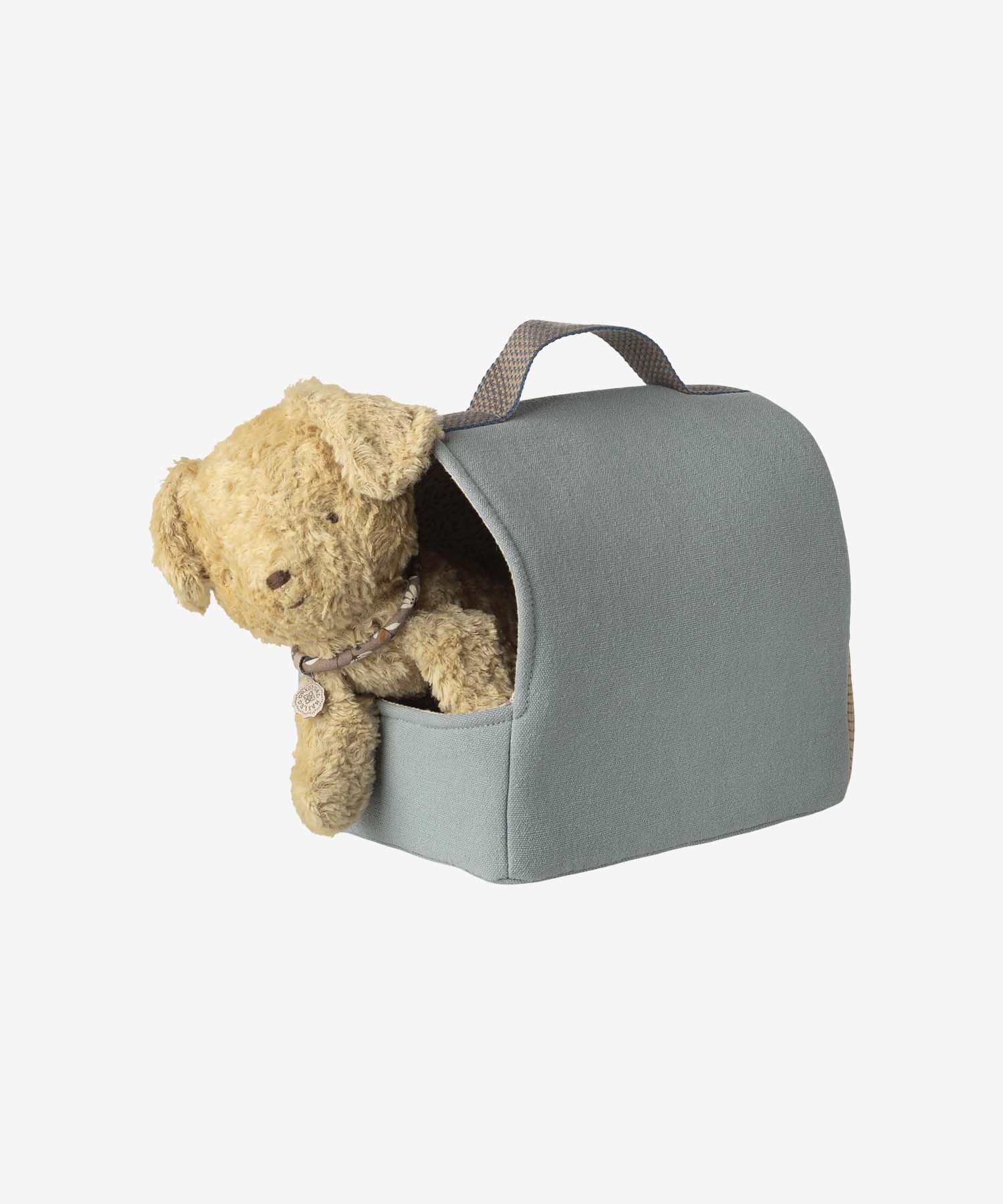 Torba dla pieska Maileg w kolorze dusty blue, idealna do przenoszenia małego pupila. W środku piesek może wygodnie odpocząć podczas podróży lub spaceru.