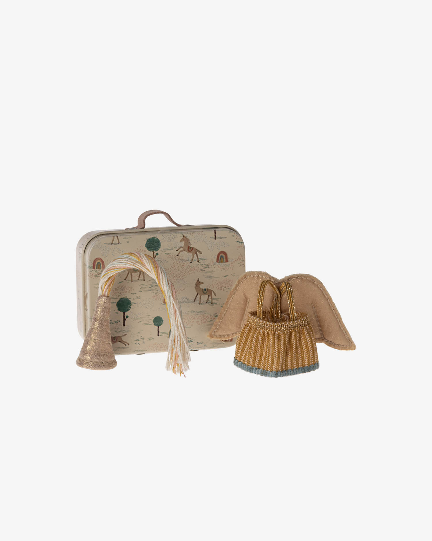 Zestaw zawiera spódnicę, skrzydełka i kapelusz. Wszystko jest zapakowane w małą metalową walizkę, dzięki czemu można je łatwo zabrać ze sobą w podróż.