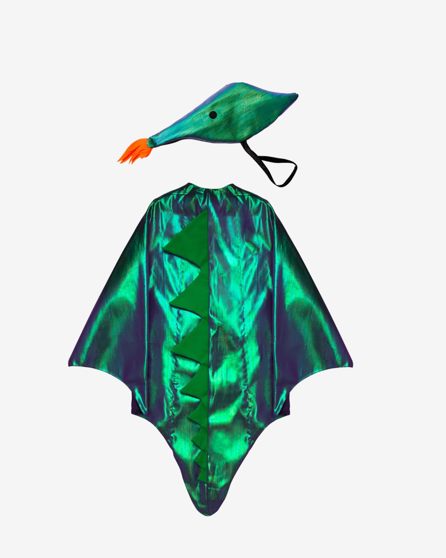 Urocze przebranie smoka od Meri Meri ze skrzydłami i nakryciem głowy, w metalicznym zielonych kolorach.