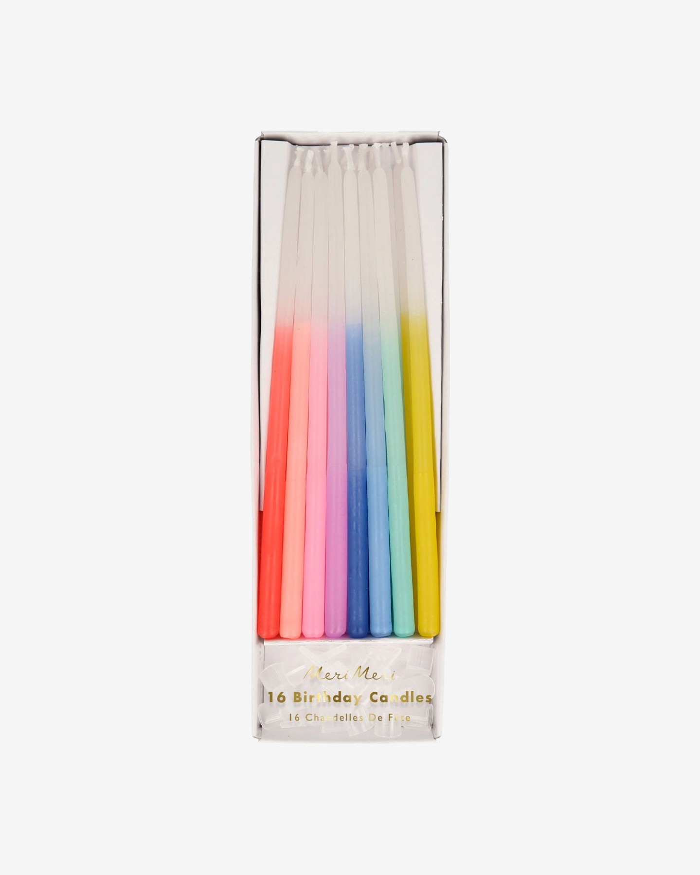 Stożkowe świeczki urodzinowe, zanurzone w pięknych odcieniach koralu, brzoskwini, różu, zgaszonego różu, błękitu, bladoniebieskiego, mięty i żółci. Świetny dodatek od Meri Meri., aby uczynić każdą urodzinową chwilę jeszcze bardziej wyjątkową.