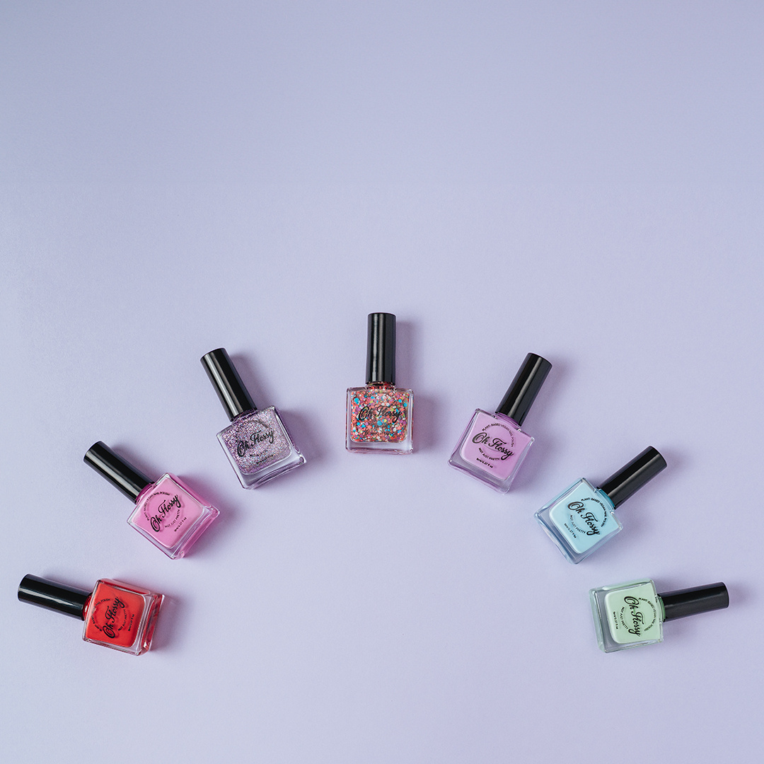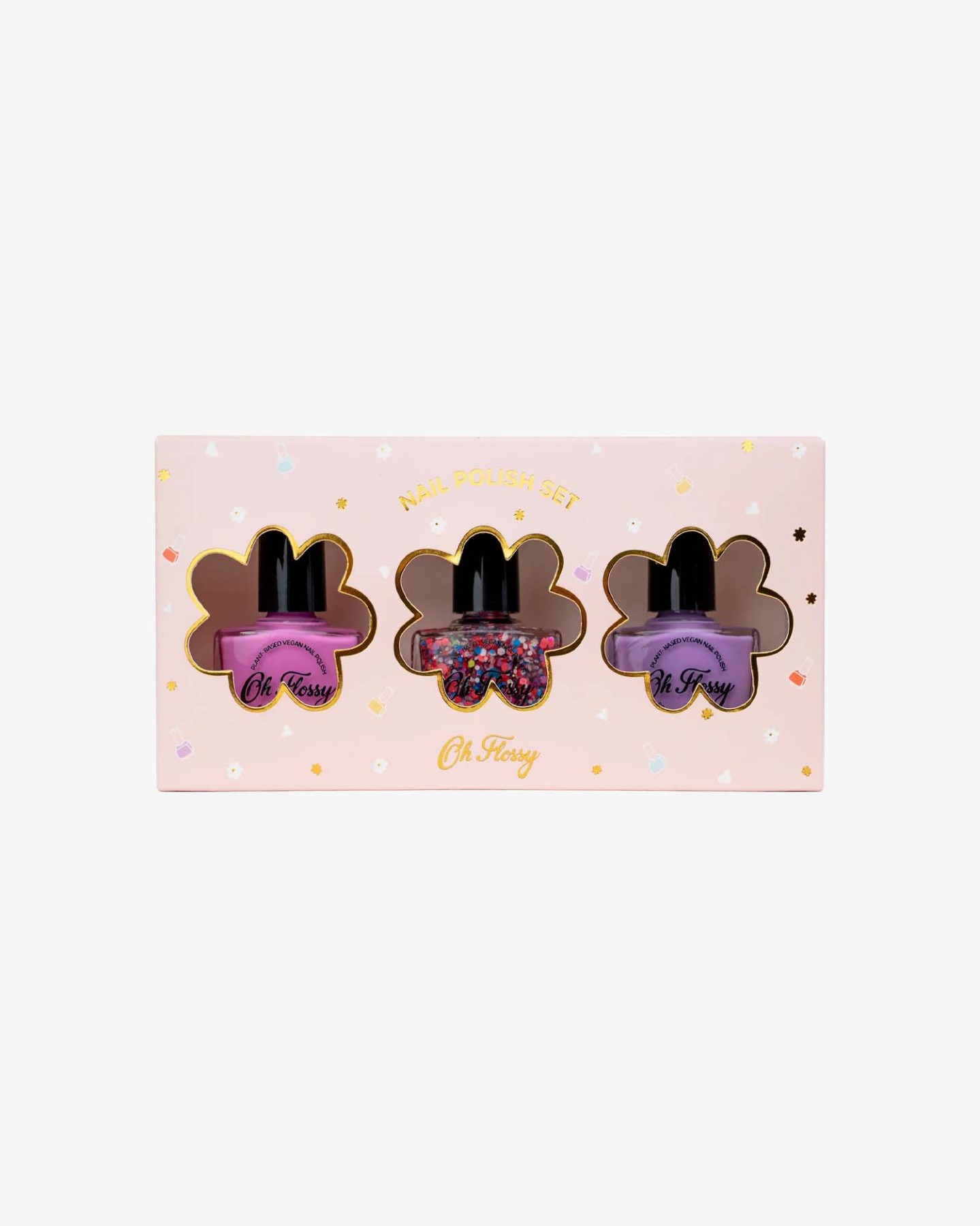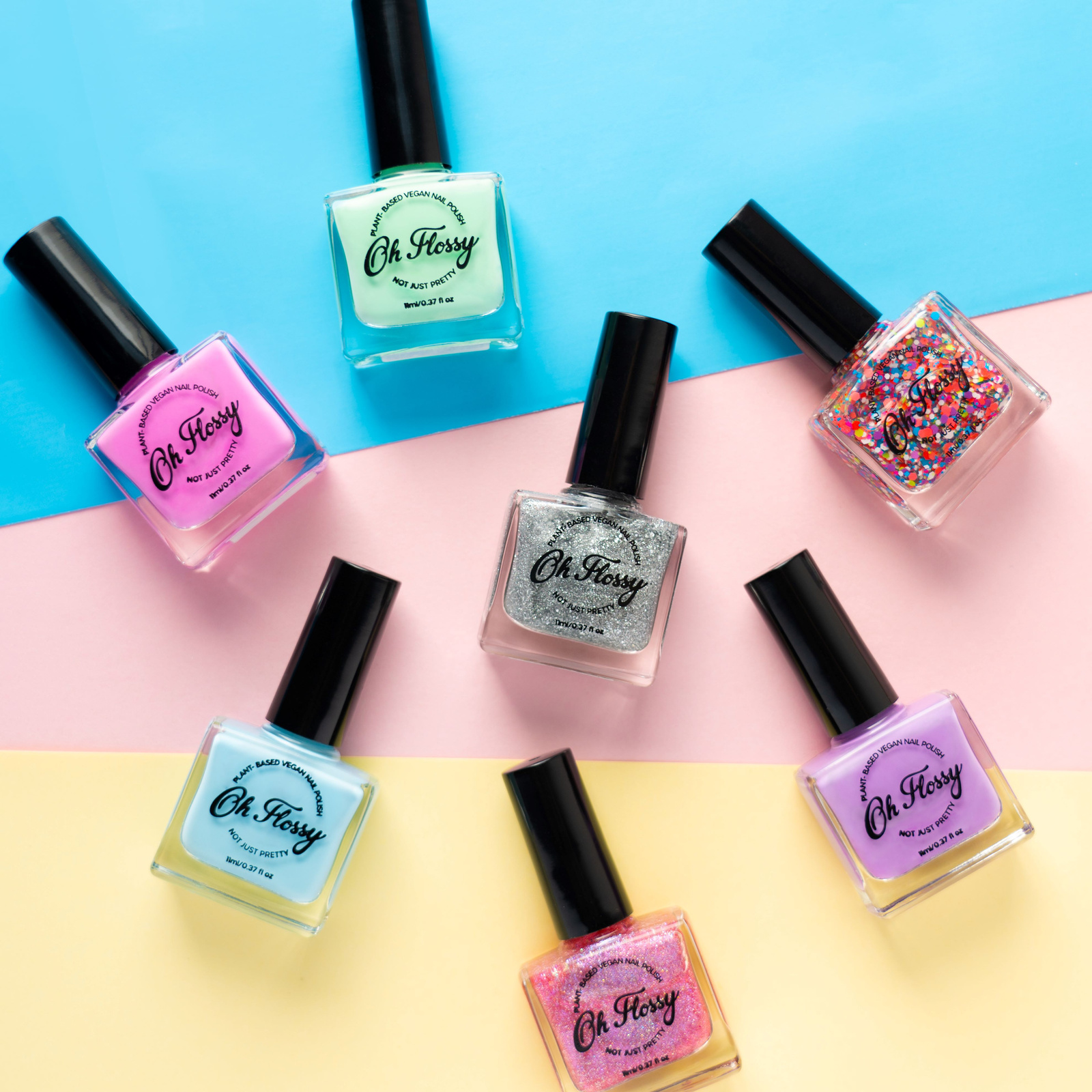 Zestaw trzech lakierów do paznokci o roślinnej formule, z dodatkiem bio brokatu od Oh Flossy