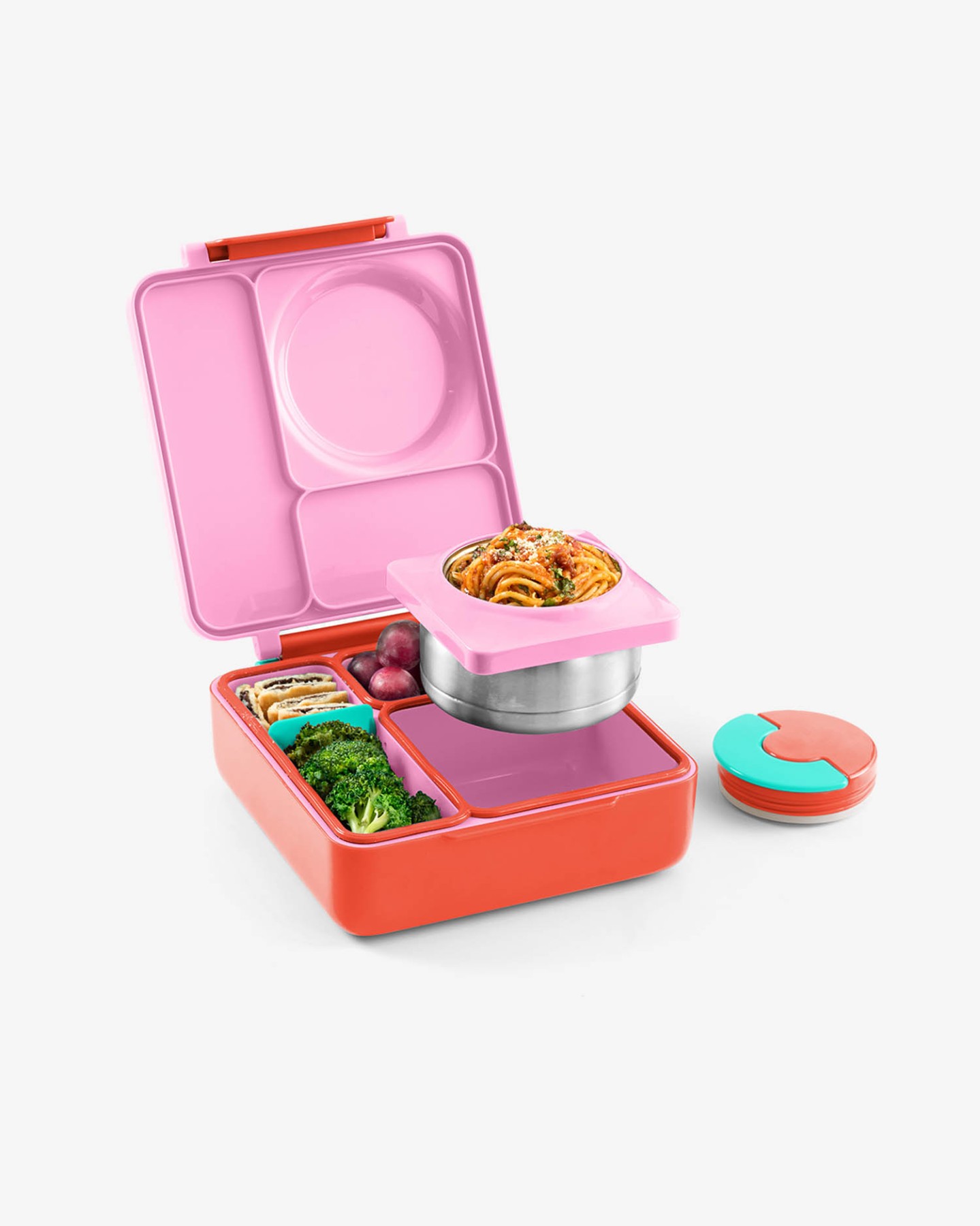 OmieBox to szczelny lunchbox z przegródkami dla dzieci wyposażony dodatkowo w wyjmowany termos obiadowy, podtrzymujący temperaturę przez około 3-4 godziny, który umożliwia przenoszenie ciepłych i zimnych dań jednocześnie.