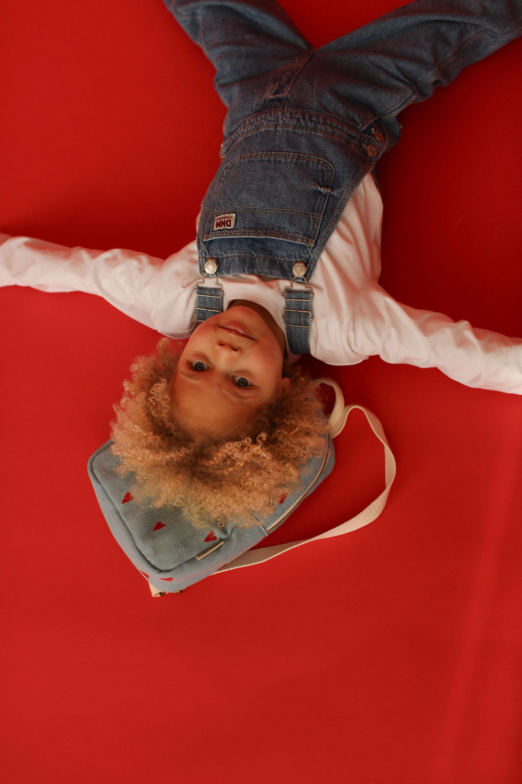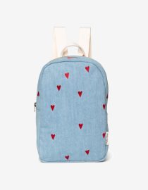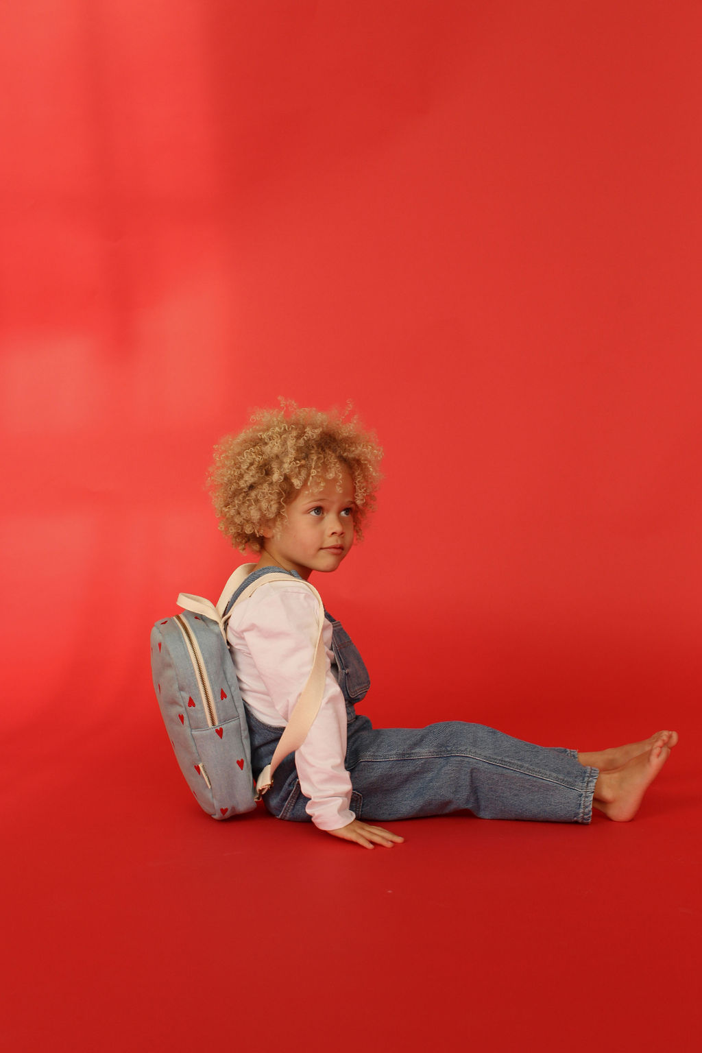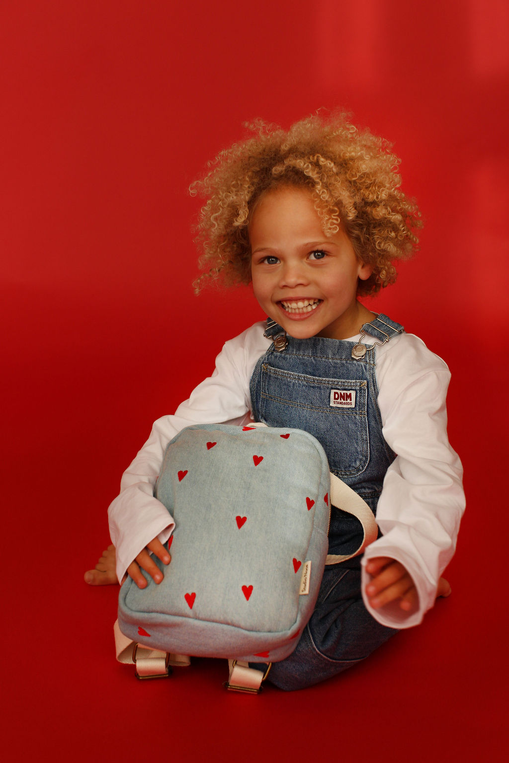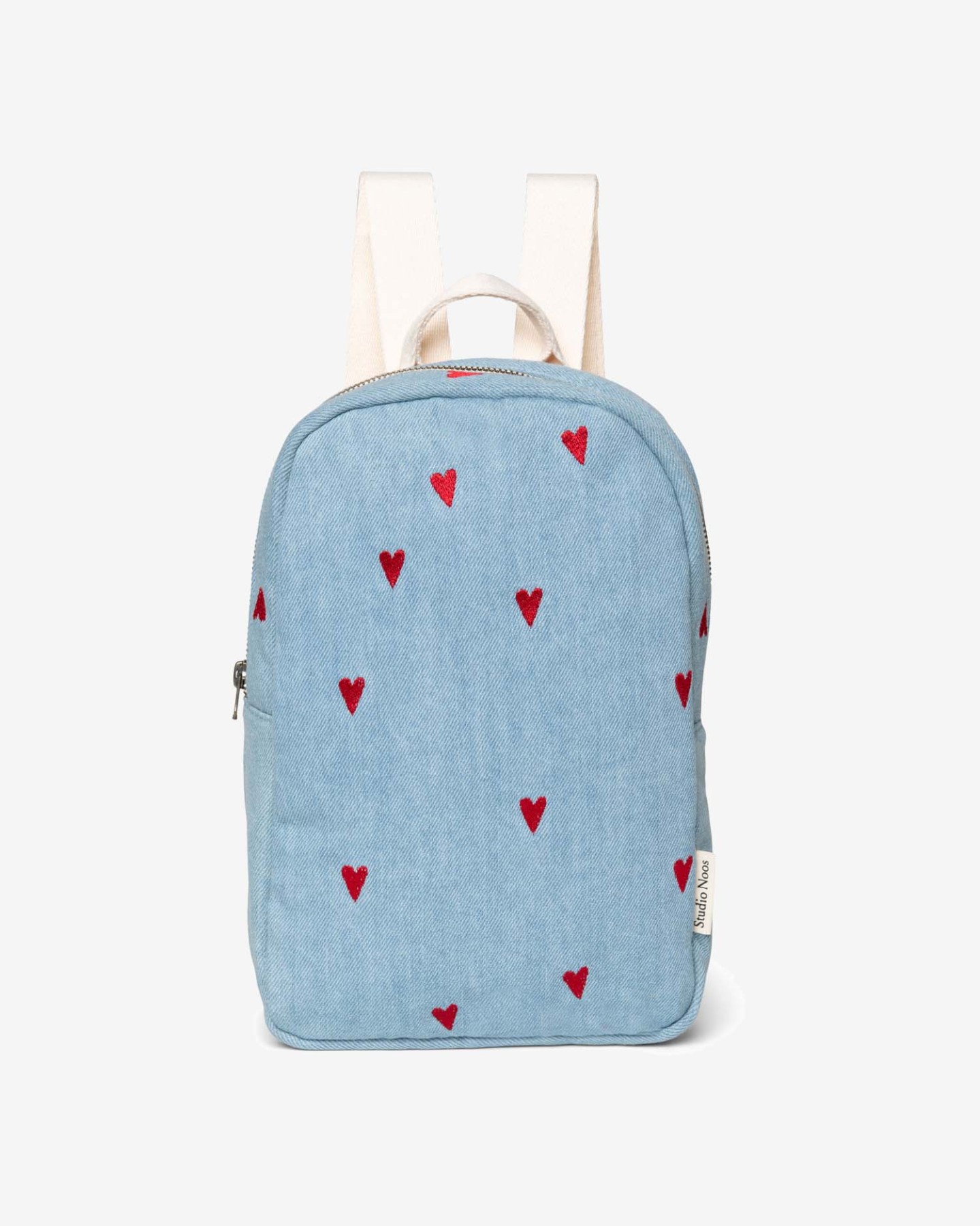 Lekki plecak od Studio Noos w jasnym denimie z haftowanymi serduszkami. Idealny dla najmłodszych, na spacer, do przedszkola czy na drobiazgi.