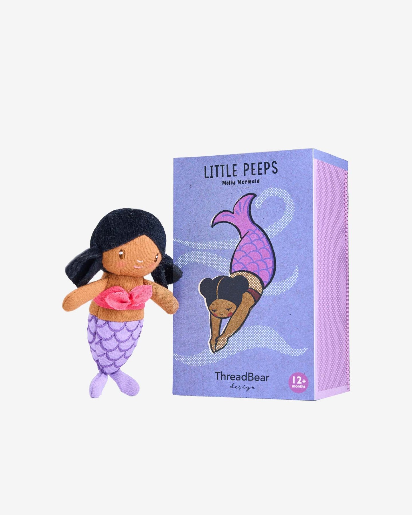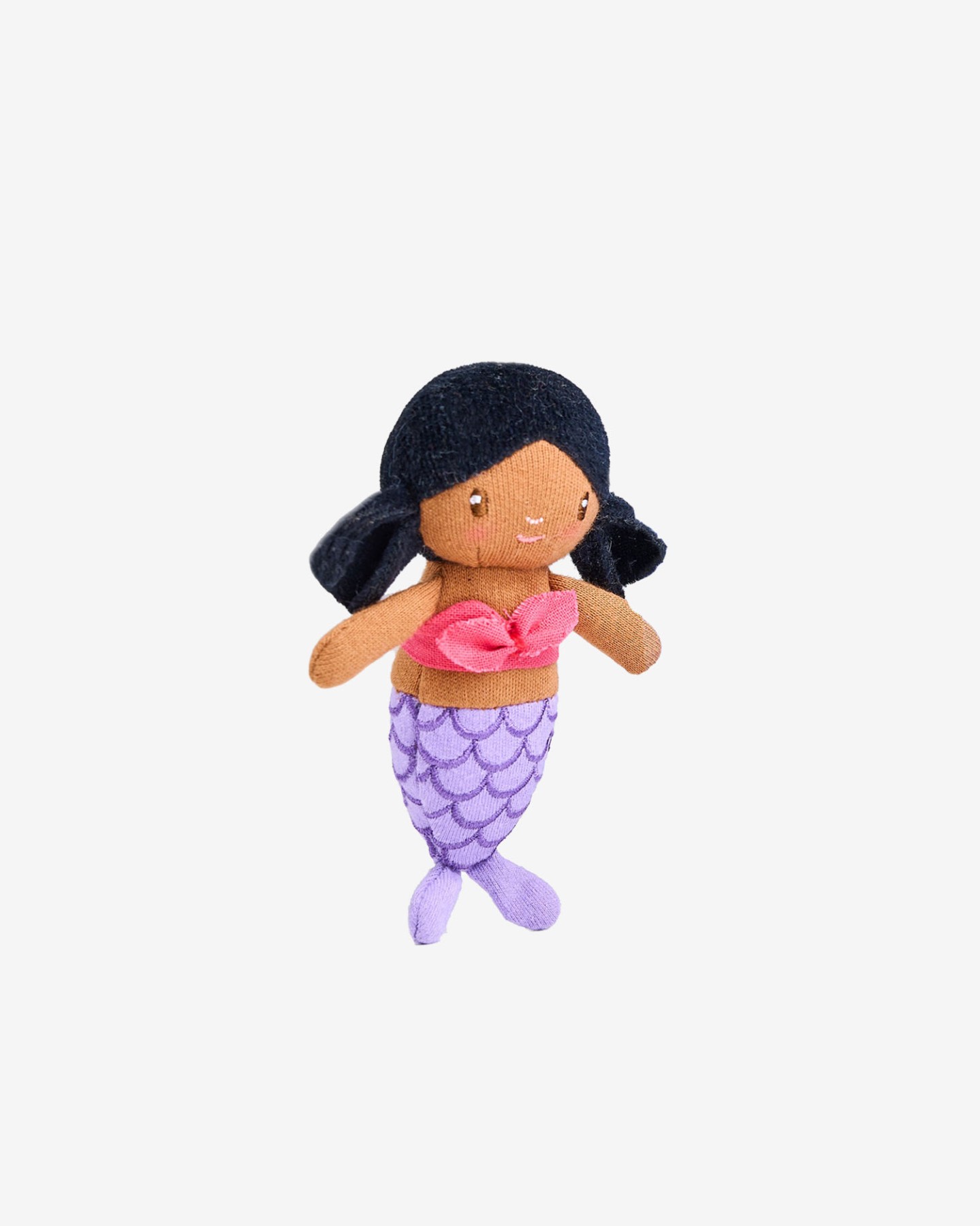 Mała bawełniana laleczka Syrenka Molly. Ubrana w top z muszelek i ogon syreny.